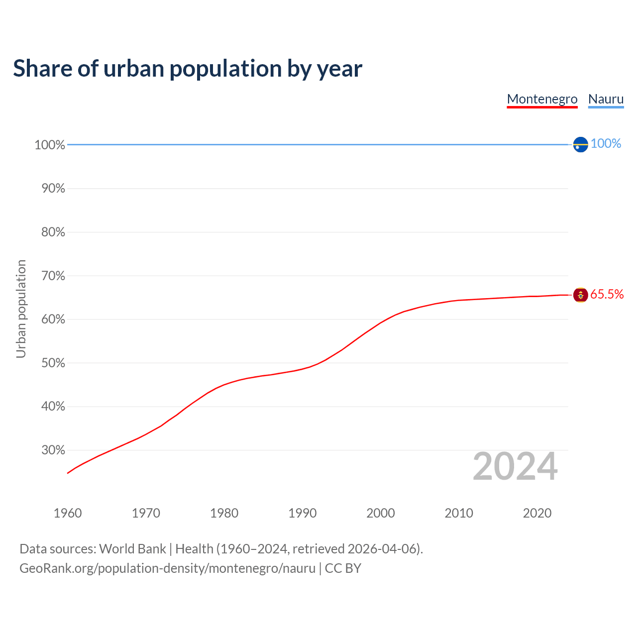 From 2004 to 2024, the share of urban population changed from 62.2% to 65.5% in Montenegro and from 100% to 100% in Nauru.