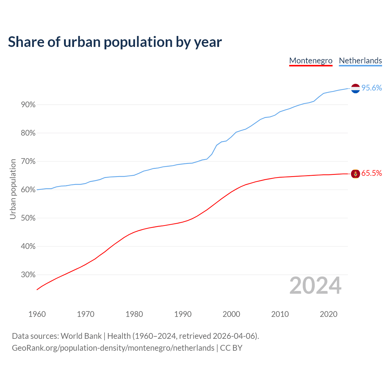From 2004 to 2024, the share of urban population changed from 62.2% to 65.5% in Montenegro and from 82.3% to 95.6% in the Netherlands.