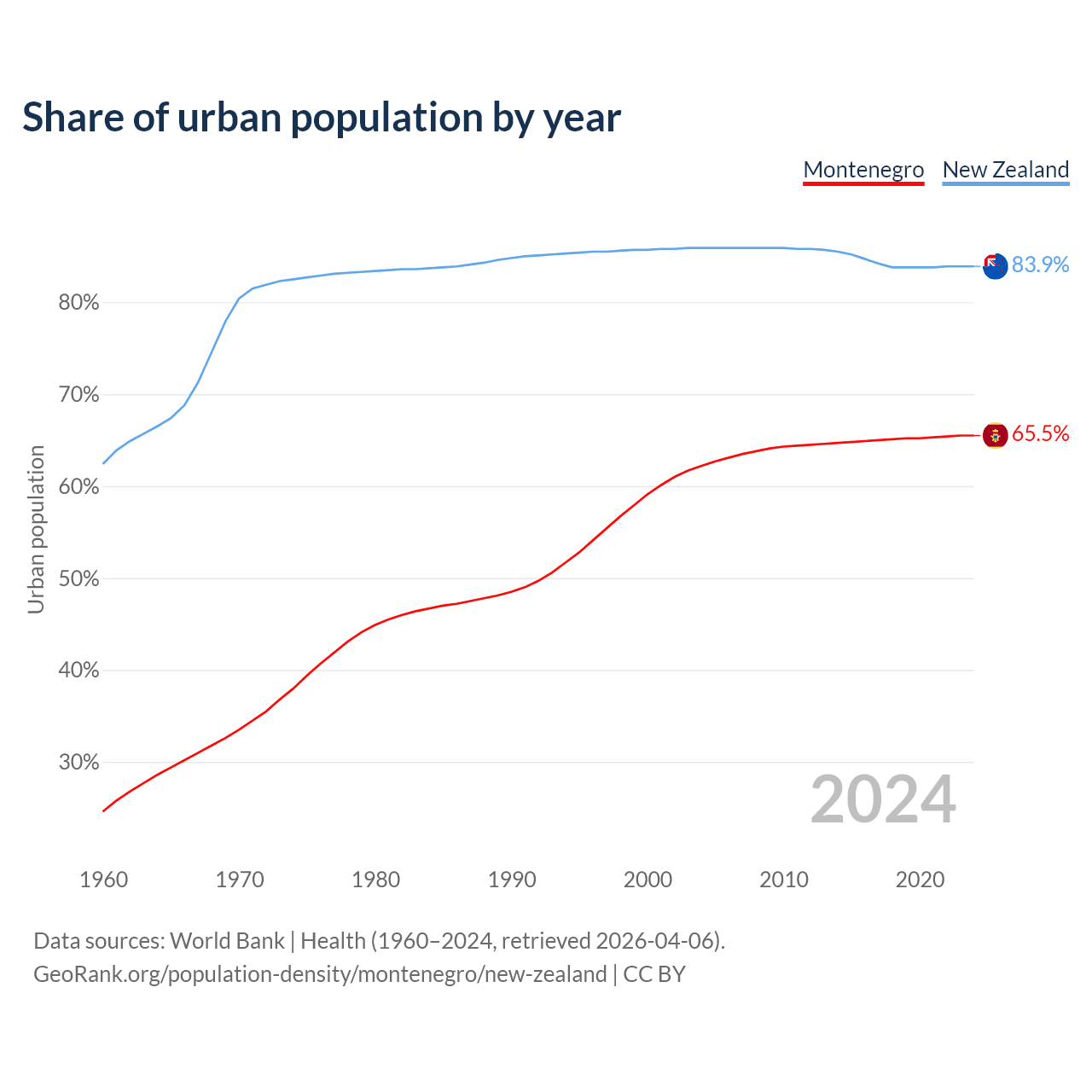 From 2004 to 2024, the share of urban population changed from 62.2% to 65.5% in Montenegro and from 85.9% to 83.9% in New Zealand.