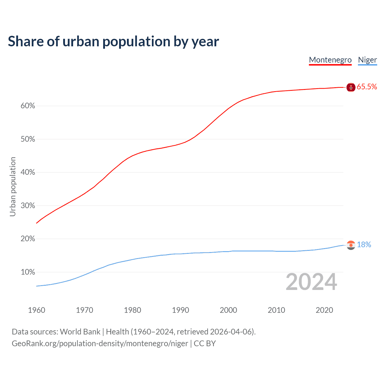 From 2004 to 2024, the share of urban population changed from 62.2% to 65.5% in Montenegro and from 16.3% to 18% in Niger.