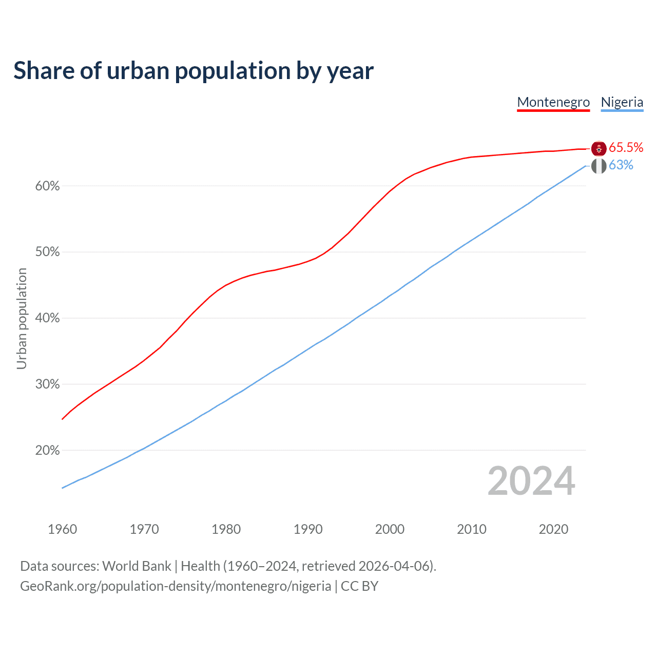 From 2004 to 2024, the share of urban population changed from 62.2% to 65.5% in Montenegro and from 46.7% to 63% in Nigeria.