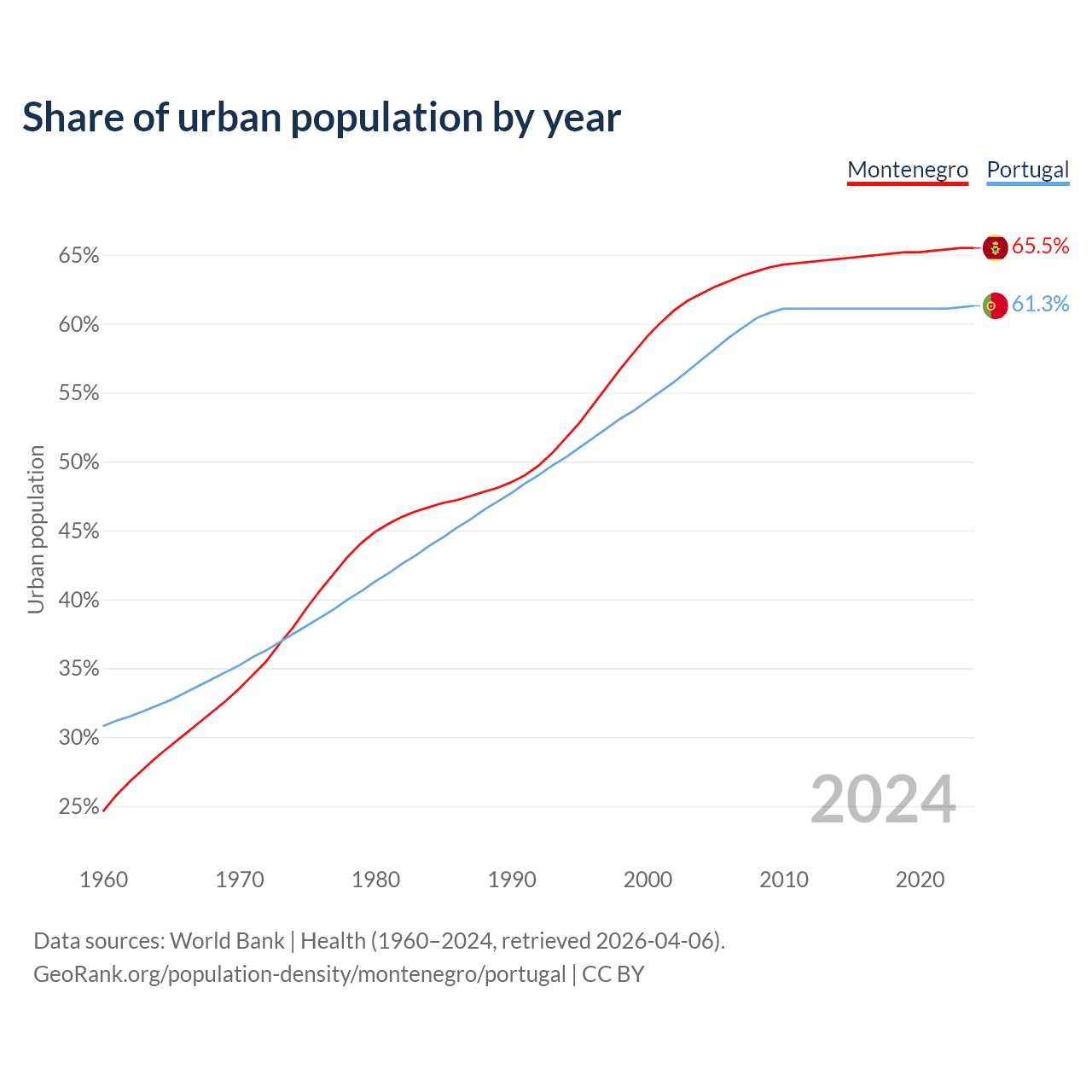 From 2004 to 2024, the share of urban population changed from 62.2% to 65.5% in Montenegro and from 57.4% to 61.3% in Portugal.
