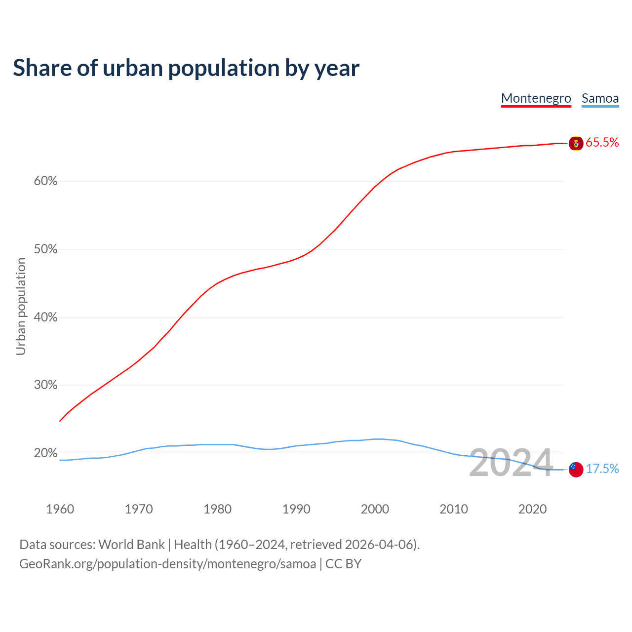 From 2004 to 2024, the share of urban population changed from 62.2% to 65.5% in Montenegro and from 21.5% to 17.5% in Samoa.
