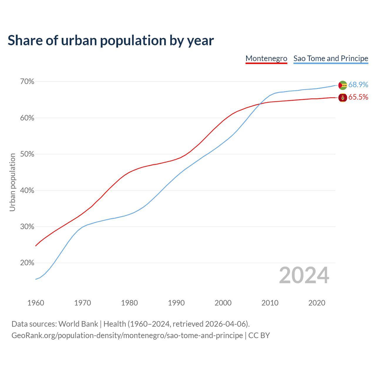 From 2004 to 2024, the share of urban population changed from 62.2% to 65.5% in Montenegro and from 57.9% to 68.9% in Sao Tome and Principe.