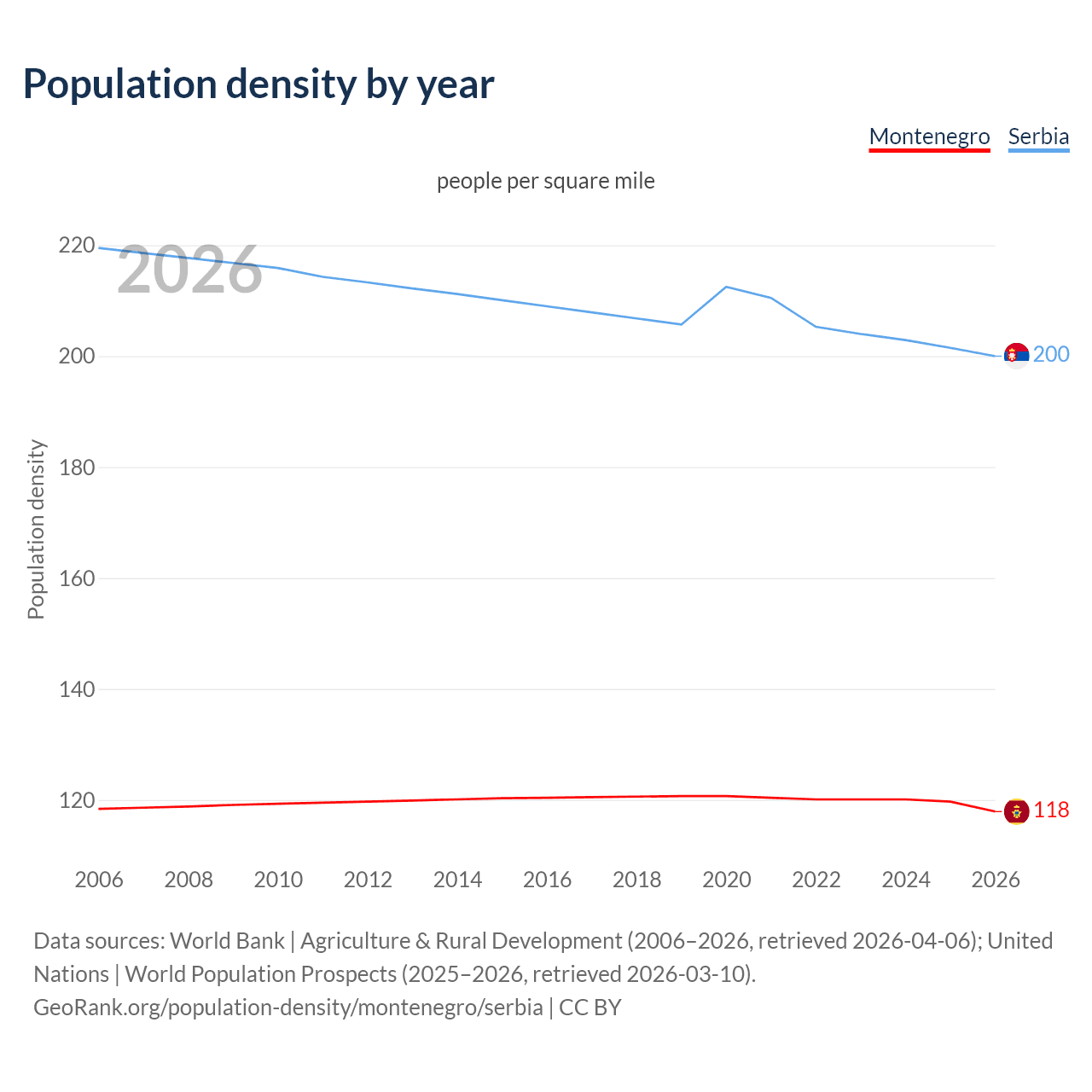 From 2006 to 2026, population density in Montenegro decreased by 0.44%, compared to a 8.86% decline in Serbia.