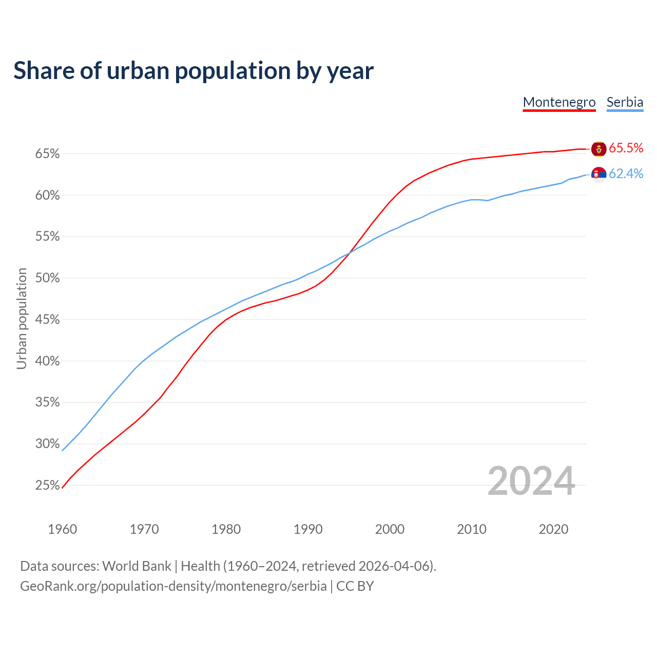 From 2004 to 2024, the share of urban population changed from 62.2% to 65.5% in Montenegro and from 57.3% to 62.4% in Serbia.
