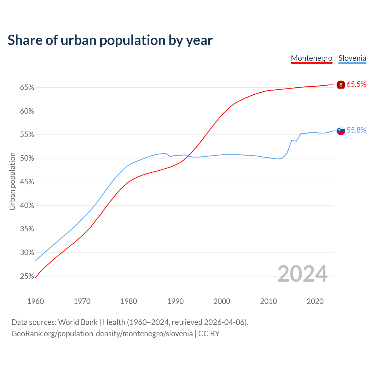 From 2004 to 2024, the share of urban population changed from 62.2% to 65.5% in Montenegro and from 50.7% to 55.8% in Slovenia.
