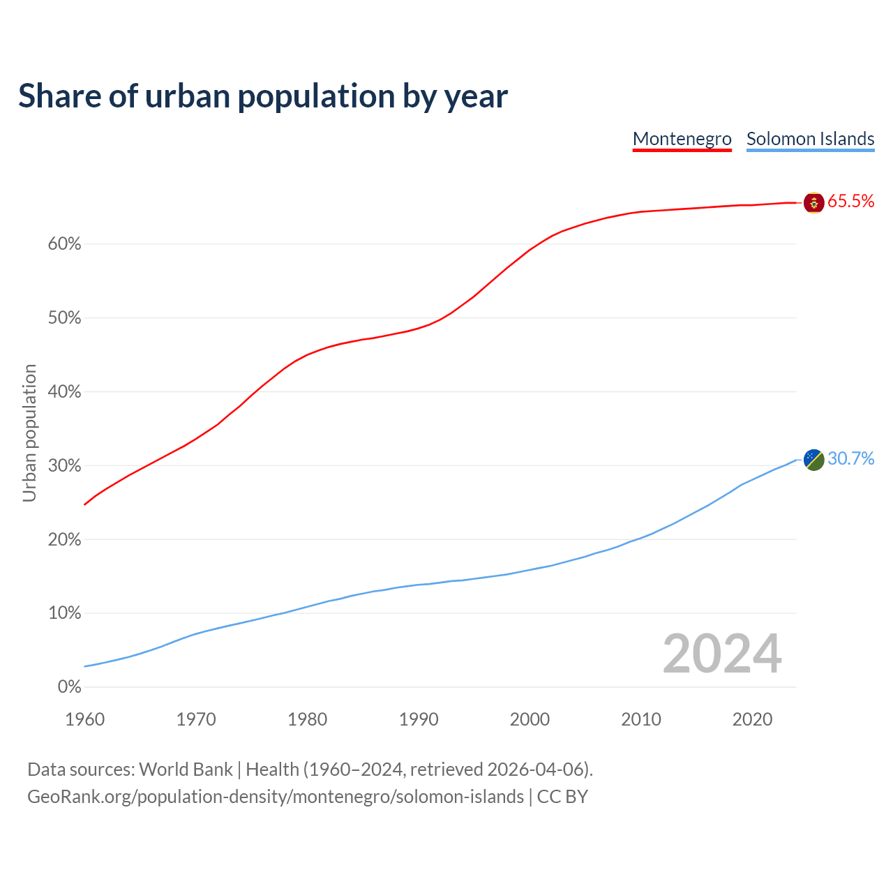 From 2004 to 2024, the share of urban population changed from 62.2% to 65.5% in Montenegro and from 17.2% to 30.7% in the Solomon Islands.