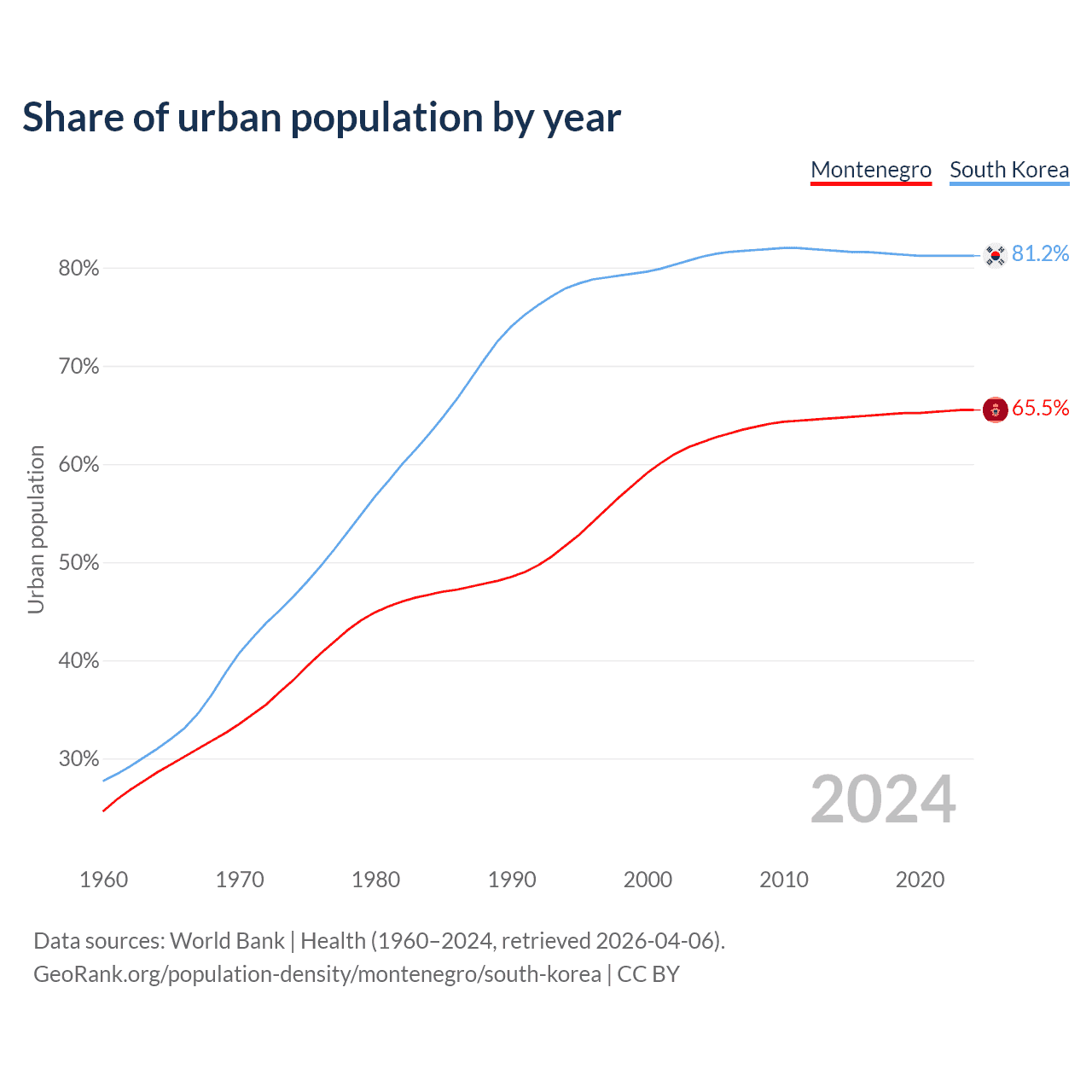 From 2004 to 2024, the share of urban population changed from 62.2% to 65.5% in Montenegro and from 81.1% to 81.2% in South Korea.