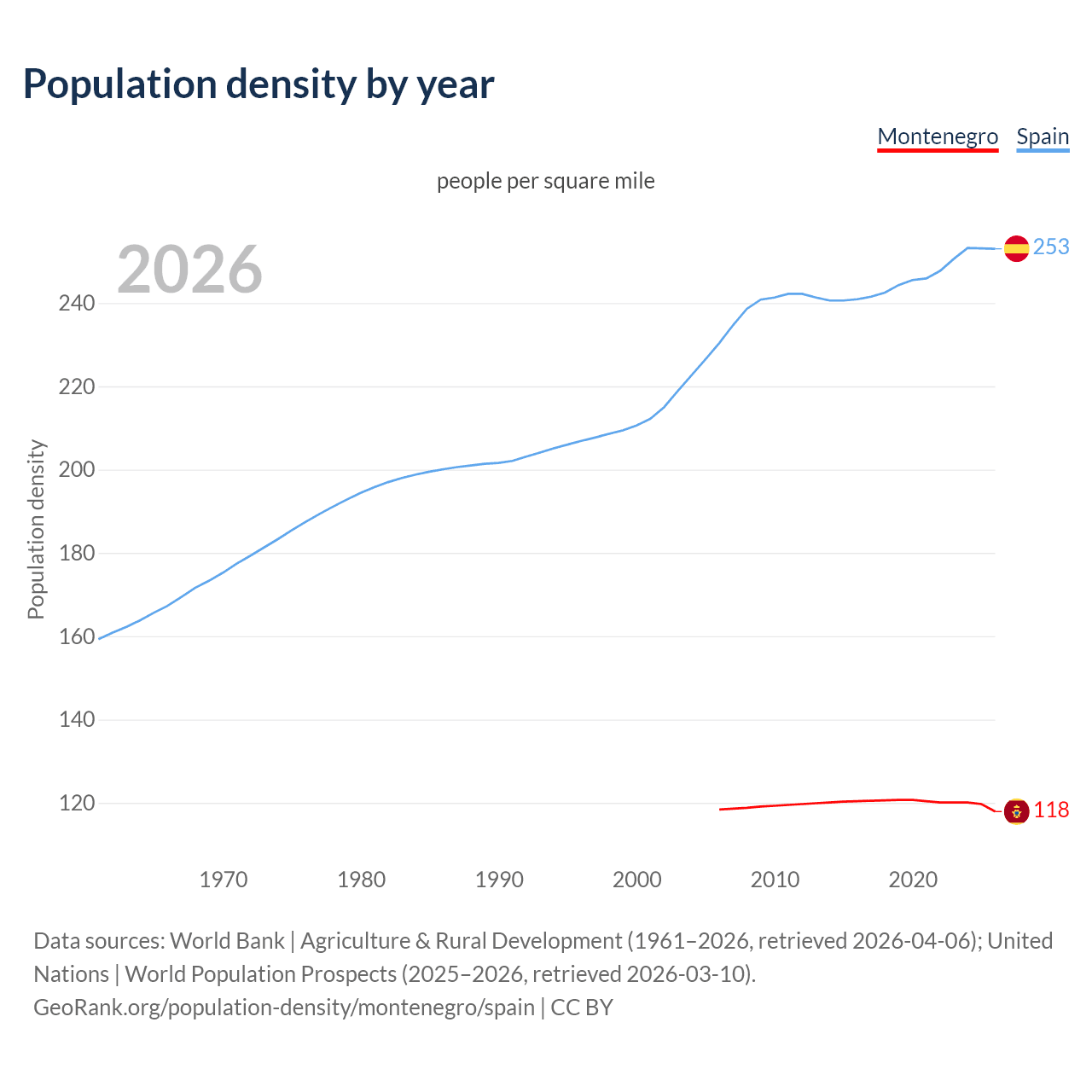 From 2006 to 2026, population density in Montenegro decreased by 0.44%, compared to a 9.77% growth in Spain.