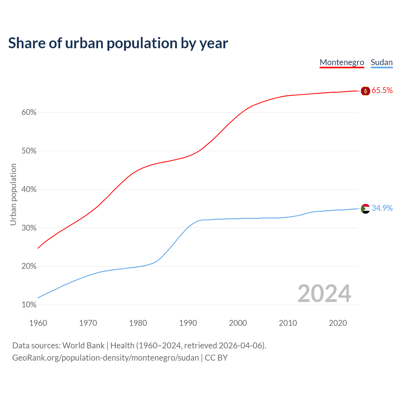 From 2004 to 2024, the share of urban population changed from 62.2% to 65.5% in Montenegro and from 32.4% to 34.9% in Sudan.
