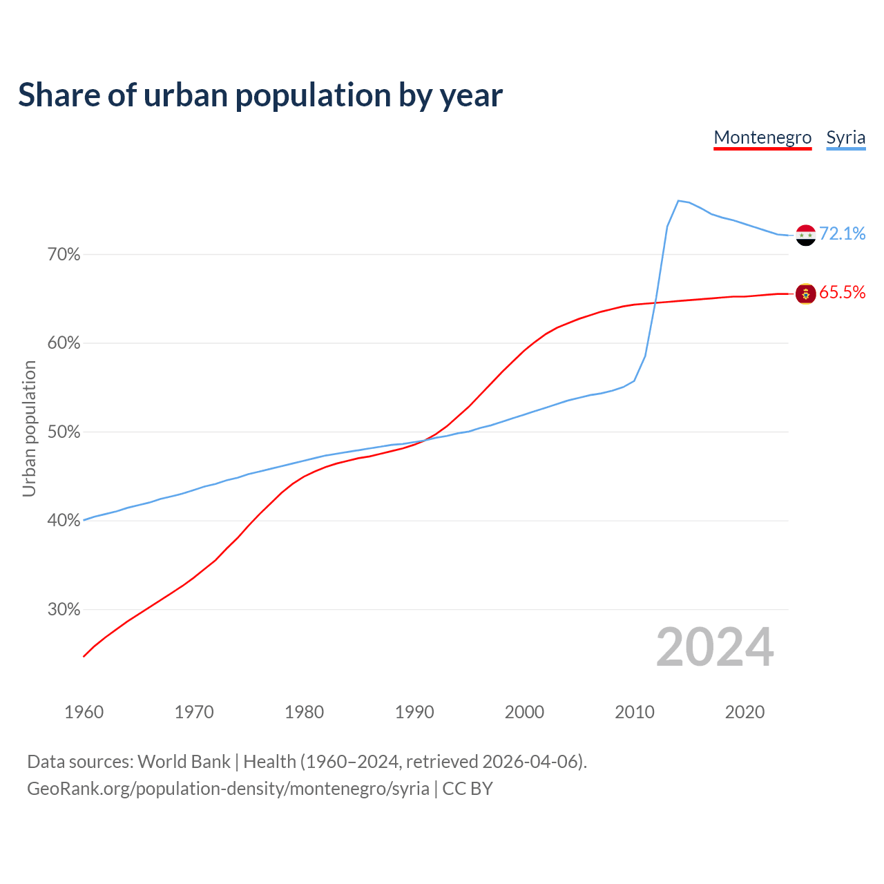 From 2004 to 2024, the share of urban population changed from 62.2% to 65.5% in Montenegro and from 53.5% to 72.1% in Syria.