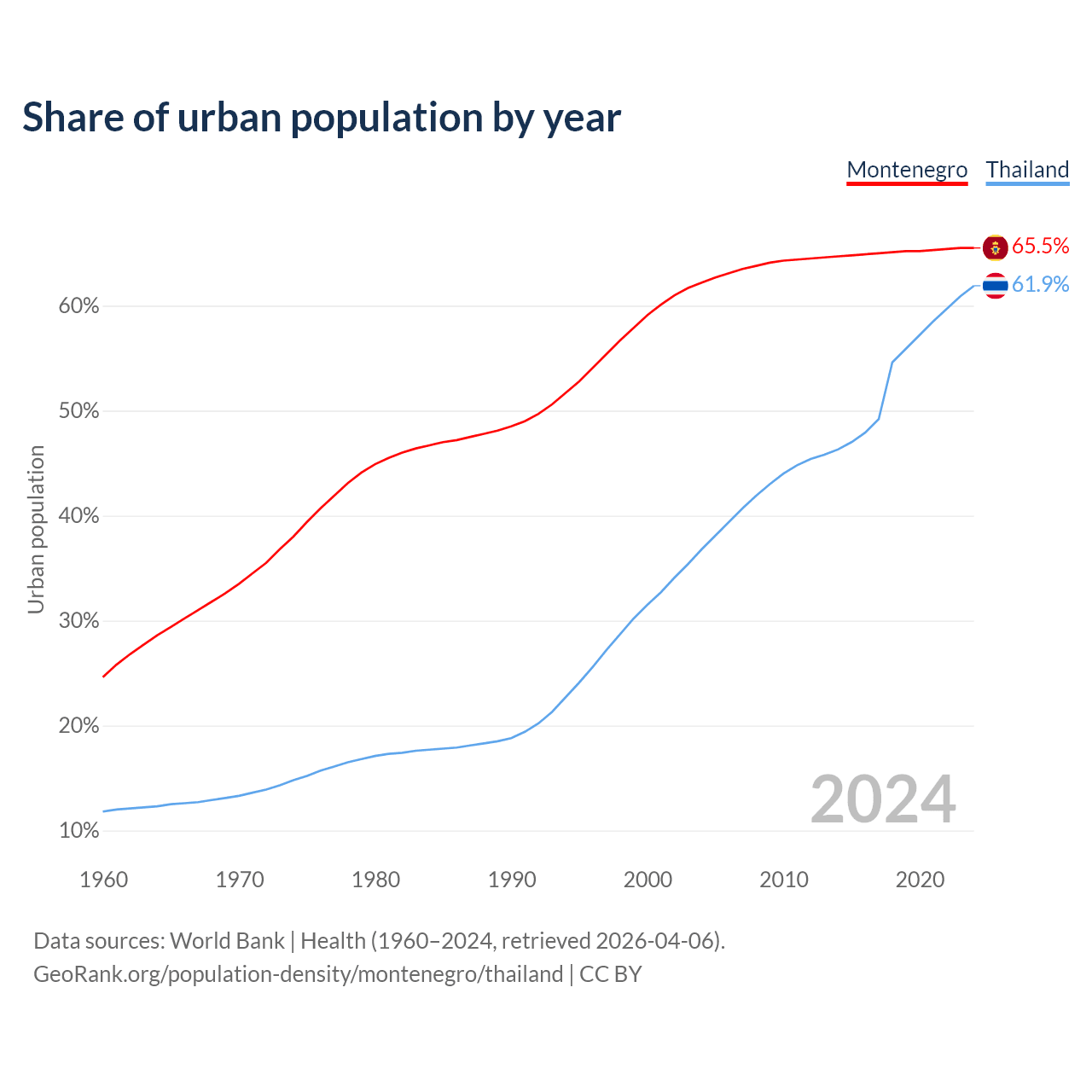 From 2004 to 2024, the share of urban population changed from 62.2% to 65.5% in Montenegro and from 36.8% to 61.9% in Thailand.