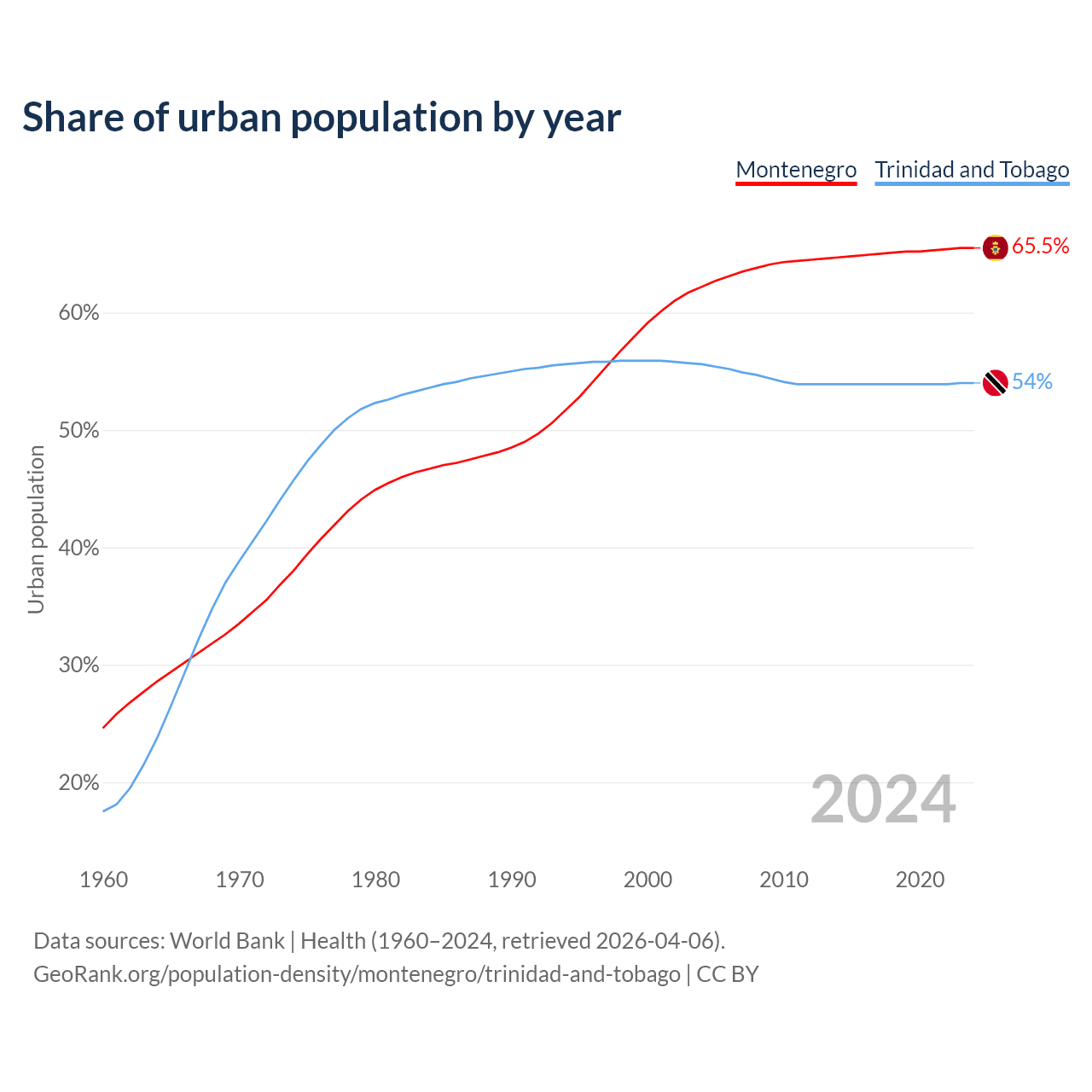 From 2004 to 2024, the share of urban population changed from 62.2% to 65.5% in Montenegro and from 55.6% to 54% in Trinidad and Tobago.