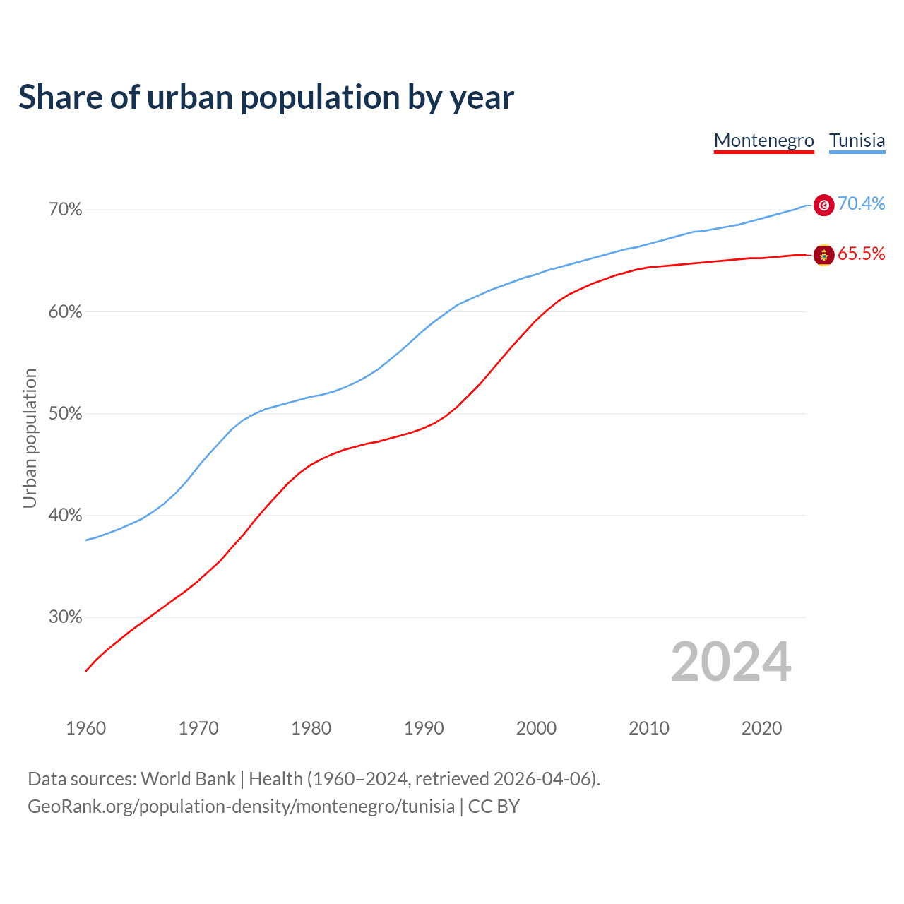 From 2004 to 2024, the share of urban population changed from 62.2% to 65.5% in Montenegro and from 64.9% to 70.4% in Tunisia.