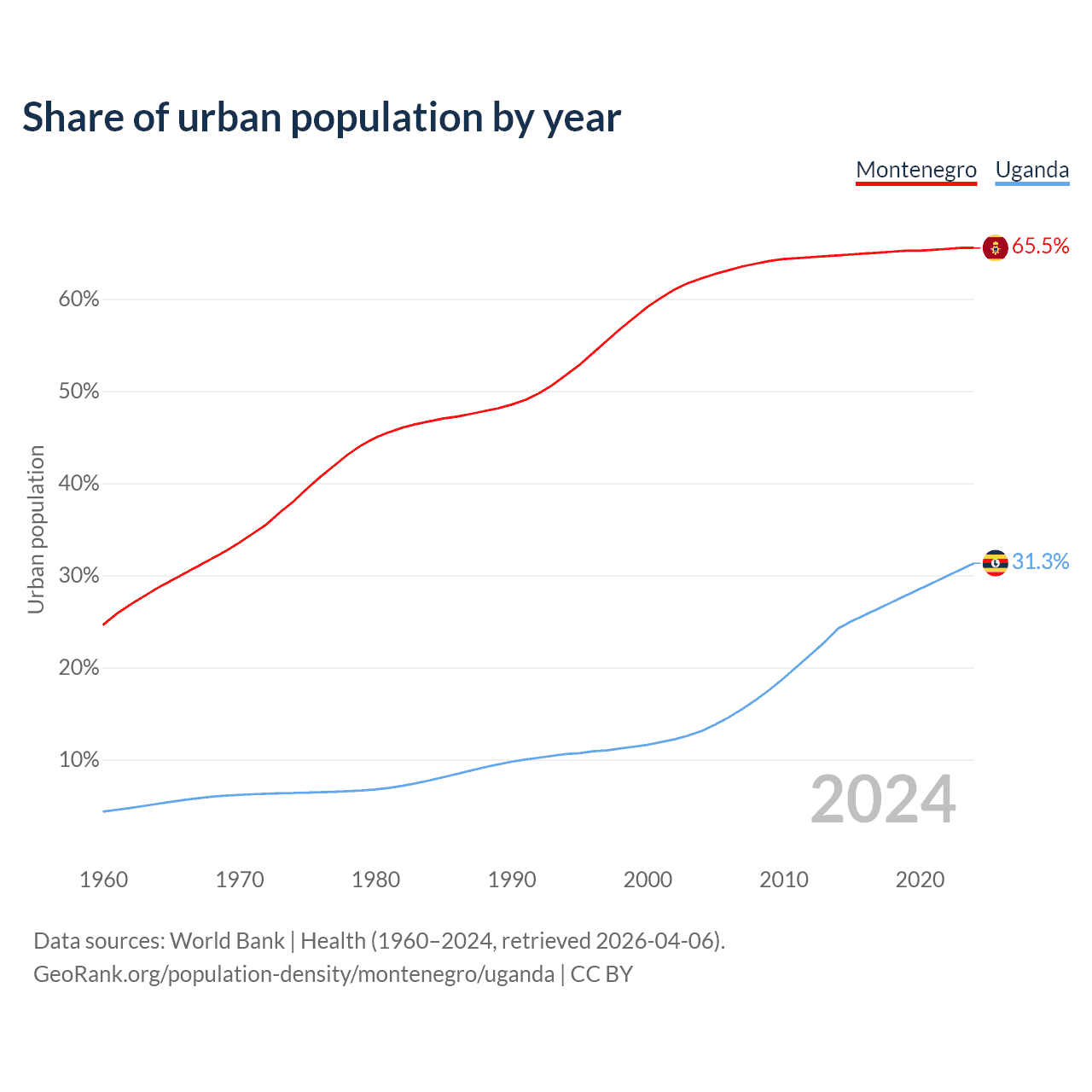 From 2004 to 2024, the share of urban population changed from 62.2% to 65.5% in Montenegro and from 13.1% to 31.3% in Uganda.