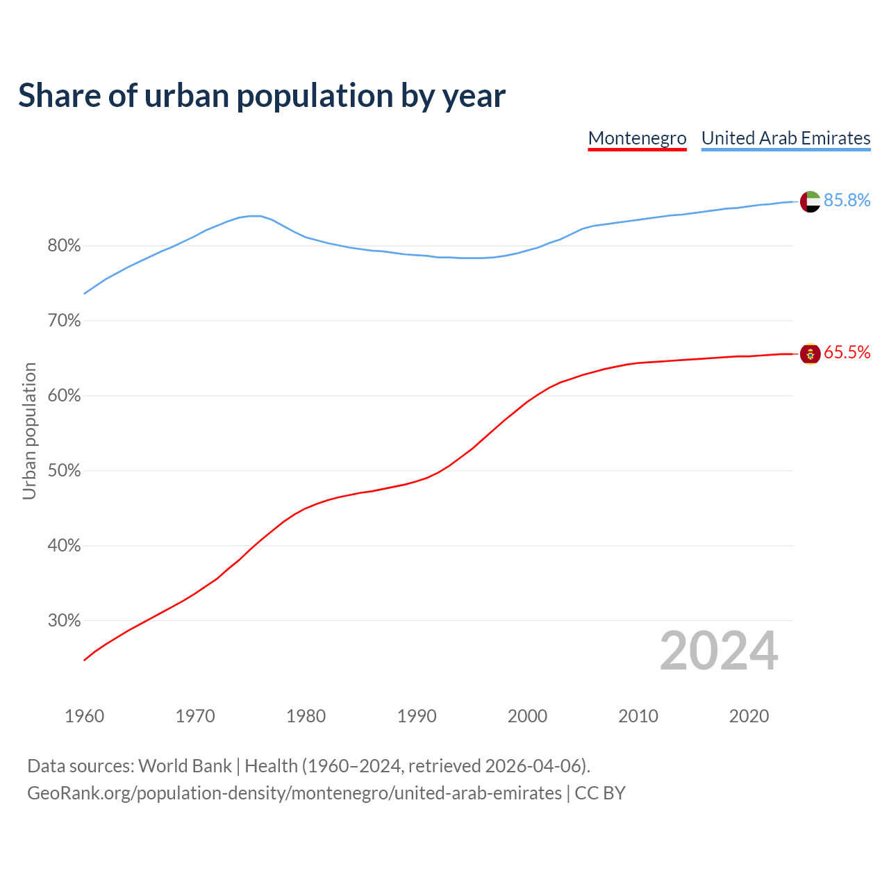 From 2004 to 2024, the share of urban population changed from 62.2% to 65.5% in Montenegro and from 81.5% to 85.8% in the United Arab Emirates.