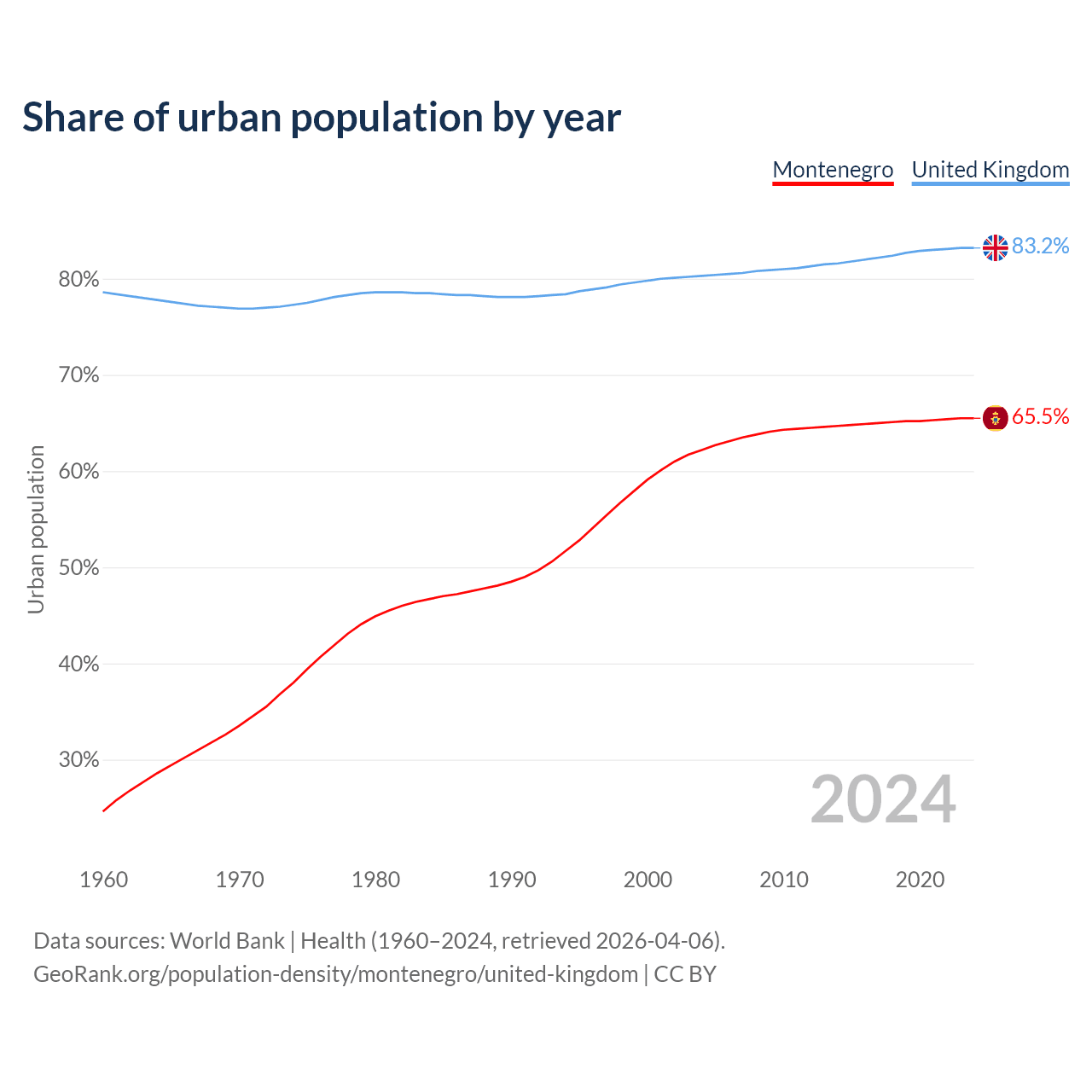 From 2004 to 2024, the share of urban population changed from 62.2% to 65.5% in Montenegro and from 80.3% to 83.2% in the United Kingdom.