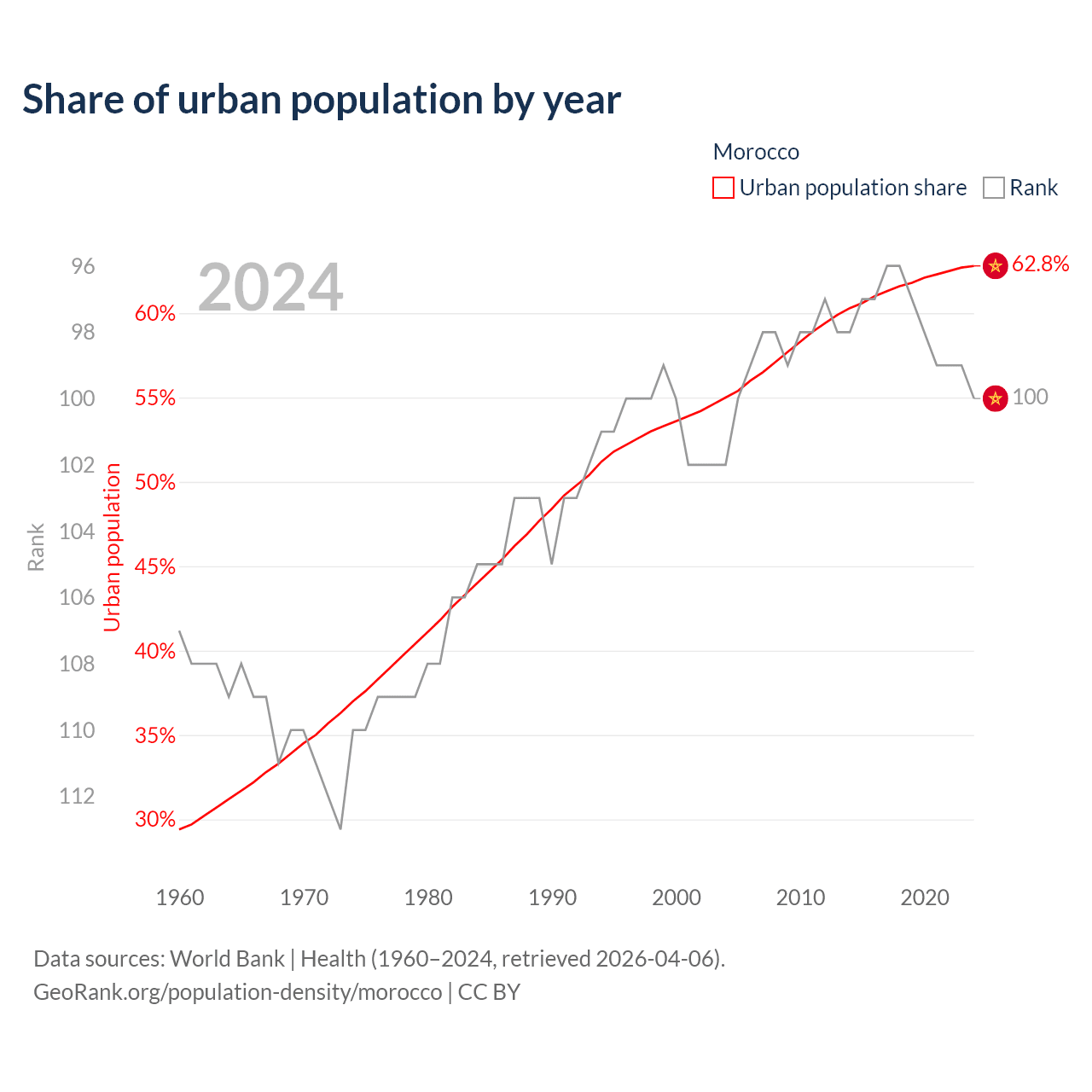 This chart shows the share of urban population in Morocco from 1960 to 2024: 29.4% lived in urban areas in 1960, 53.6% in 2000, and 62.8% in 2024.