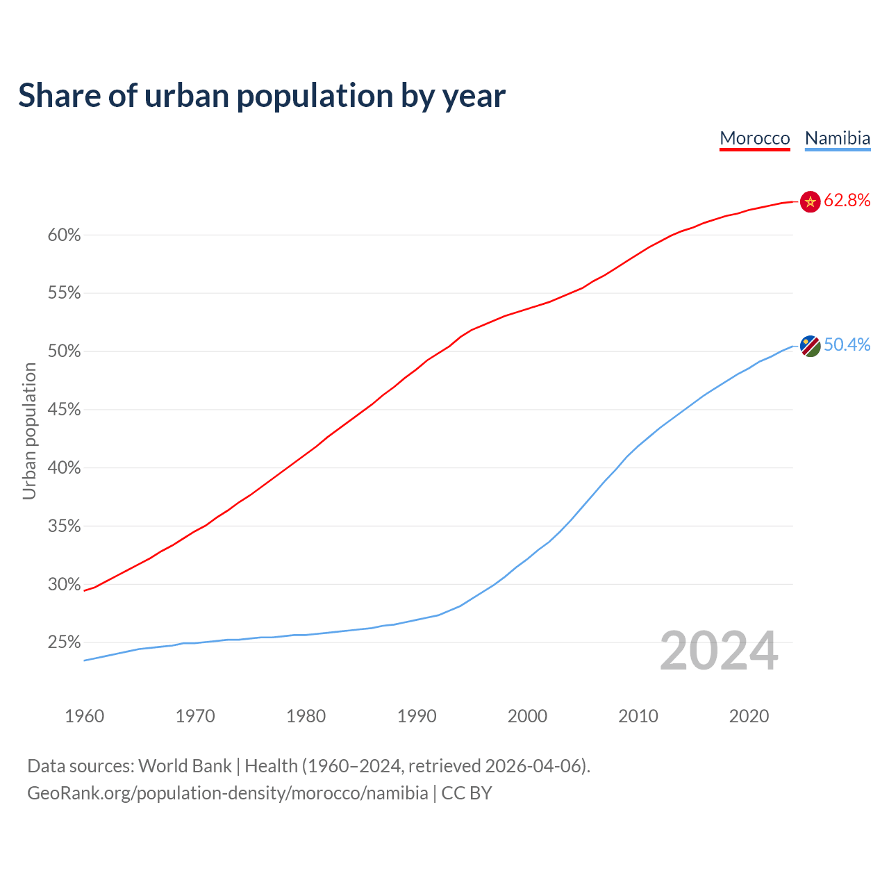 From 2004 to 2024, the share of urban population changed from 55% to 62.8% in Morocco and from 35.5% to 50.4% in Namibia.