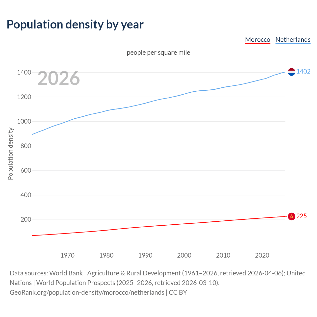 From 2006 to 2026, population density in Morocco increased by 26%, compared to a 11.8% growth in the Netherlands.