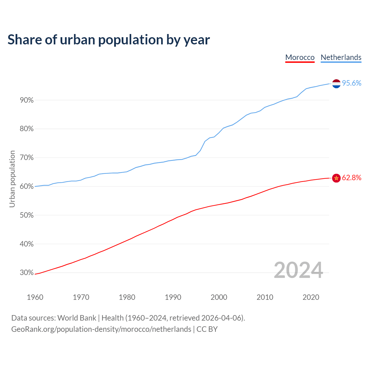 From 2004 to 2024, the share of urban population changed from 55% to 62.8% in Morocco and from 82.3% to 95.6% in the Netherlands.