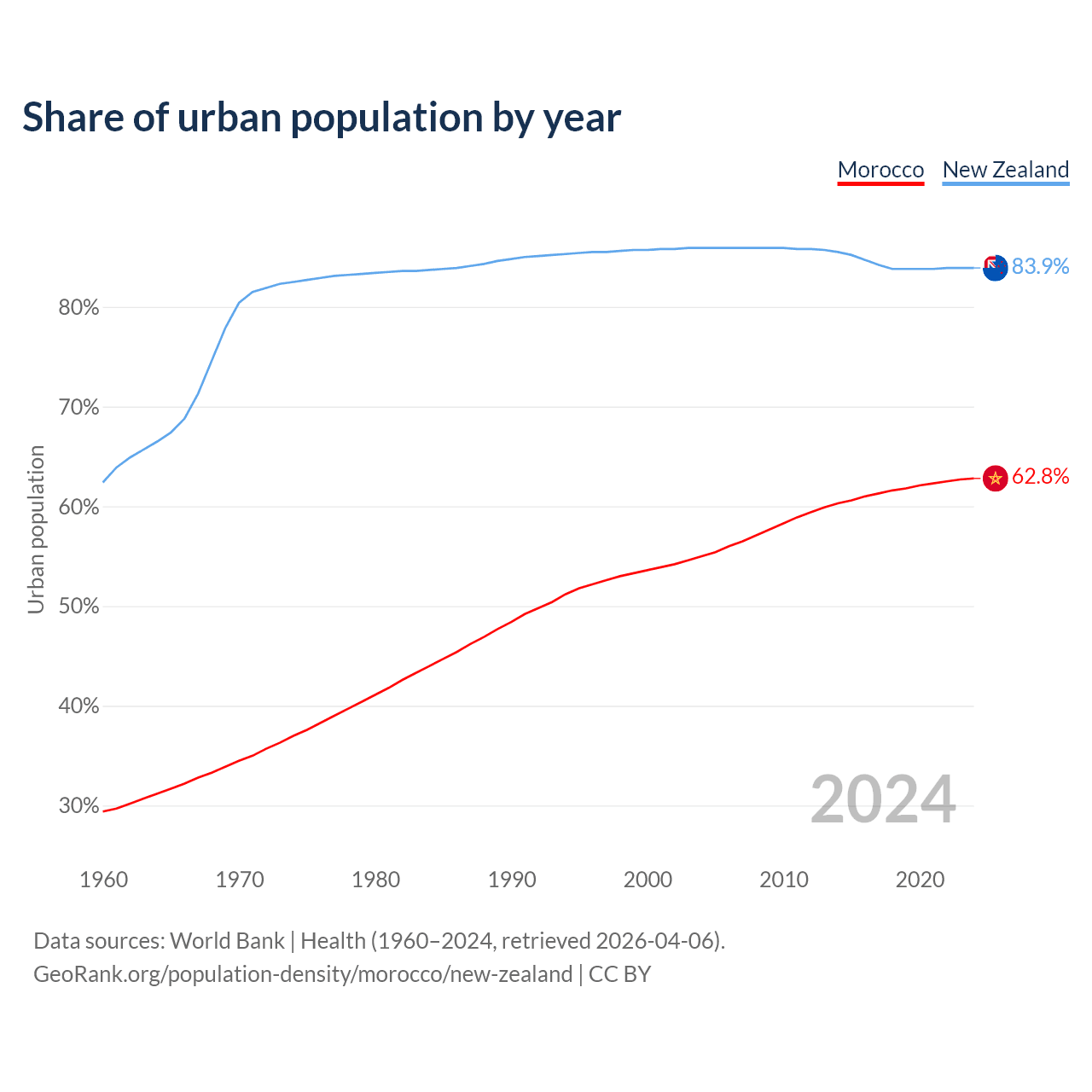 From 2004 to 2024, the share of urban population changed from 55% to 62.8% in Morocco and from 85.9% to 83.9% in New Zealand.