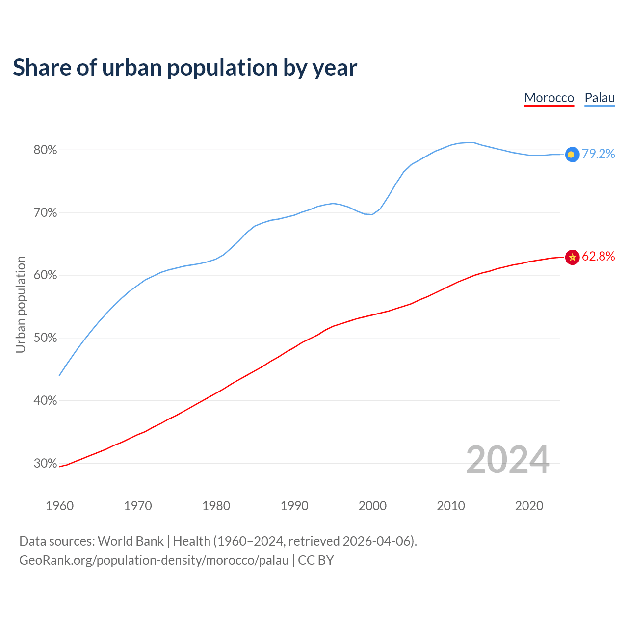 From 2004 to 2024, the share of urban population changed from 55% to 62.8% in Morocco and from 76.4% to 79.2% in Palau.