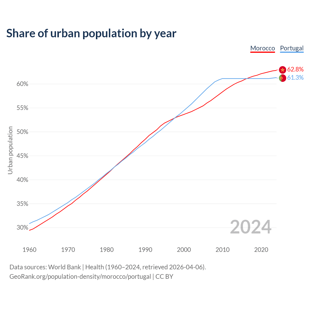 From 2004 to 2024, the share of urban population changed from 55% to 62.8% in Morocco and from 57.4% to 61.3% in Portugal.
