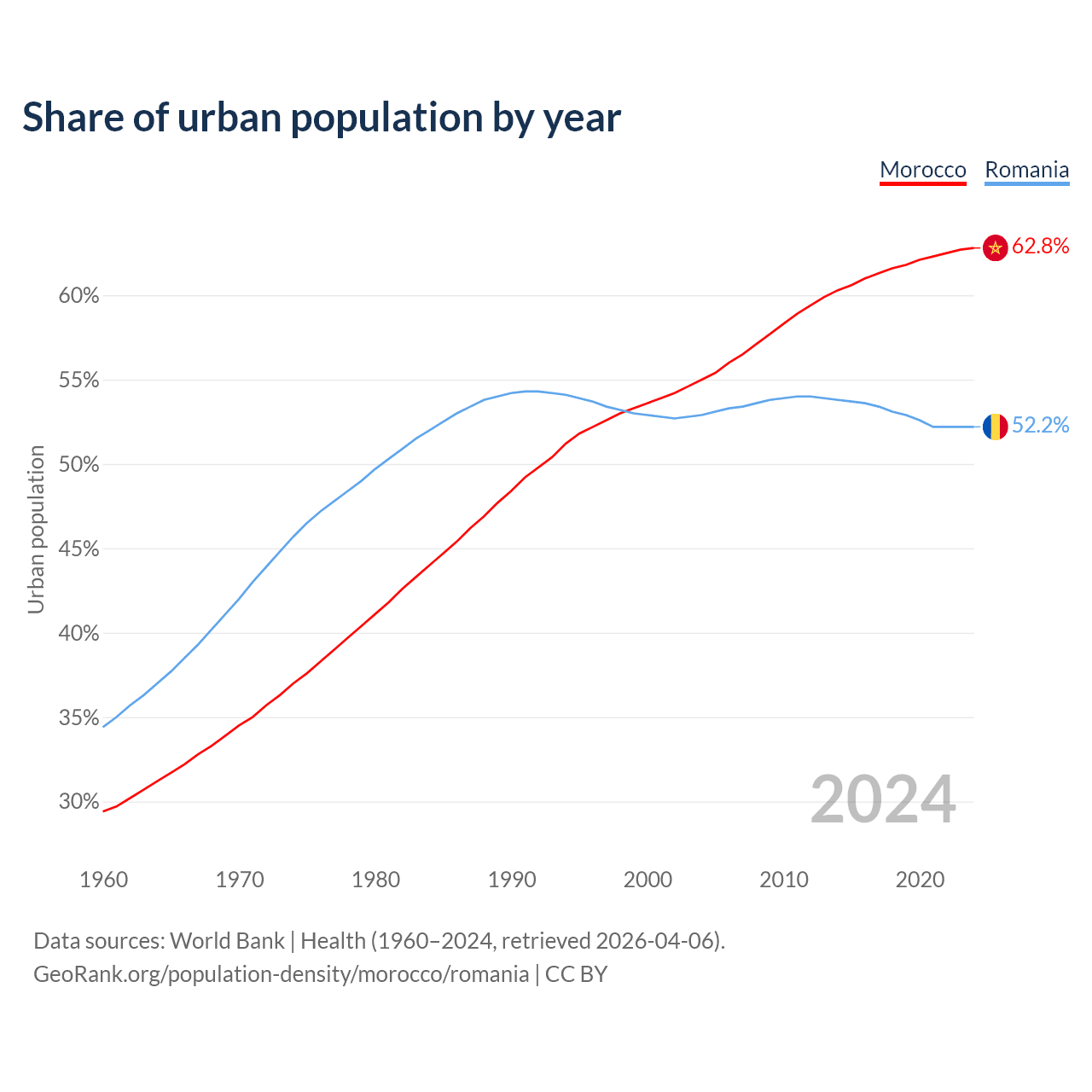 From 2004 to 2024, the share of urban population changed from 55% to 62.8% in Morocco and from 52.9% to 52.2% in Romania.