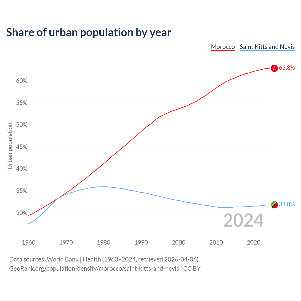 From 2004 to 2024, the share of urban population changed from 55% to 62.8% in Morocco and from 32.1% to 31.8% in Saint Kitts and Nevis.