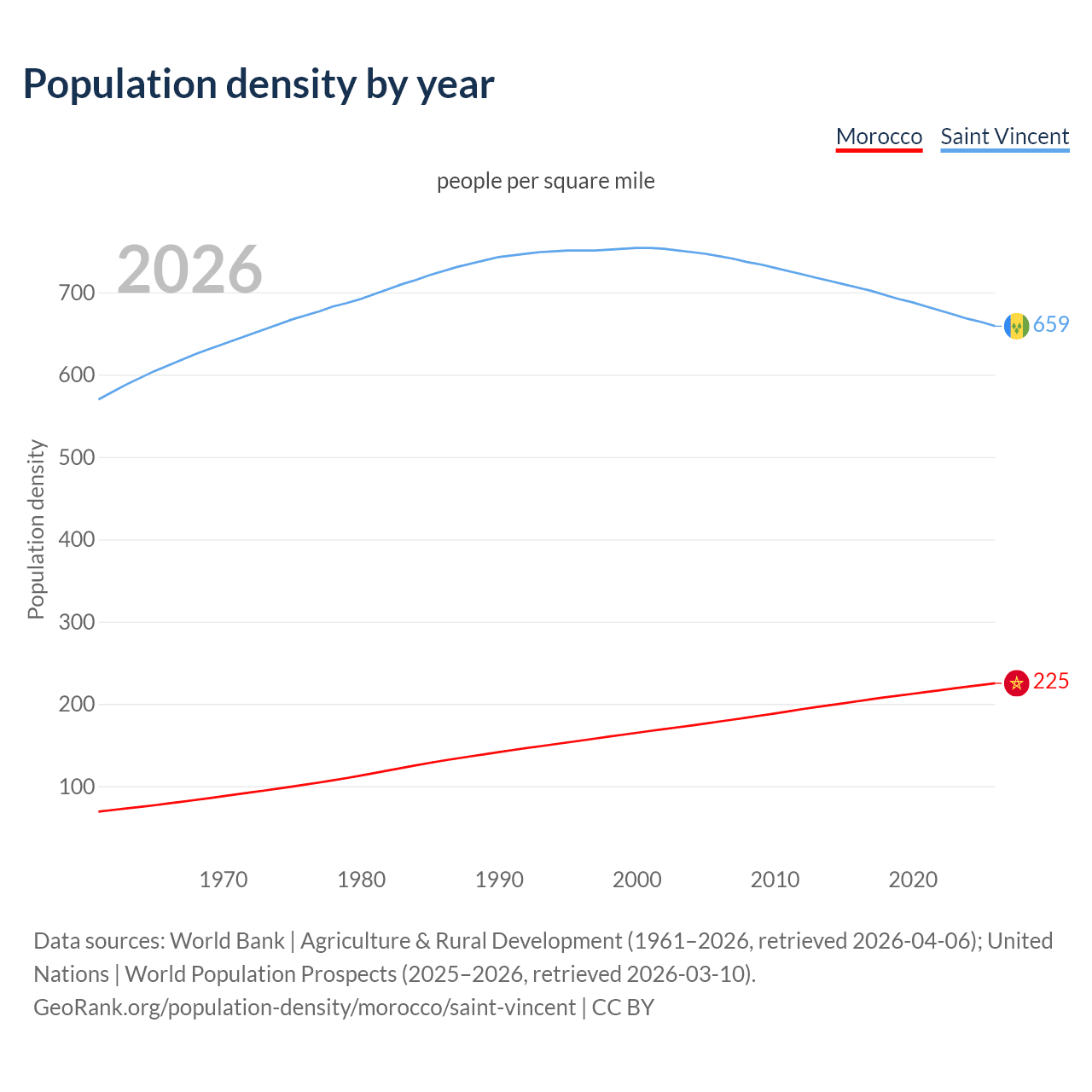From 2006 to 2026, population density in Morocco increased by 26%, compared to a 11.4% decline in Saint Vincent.