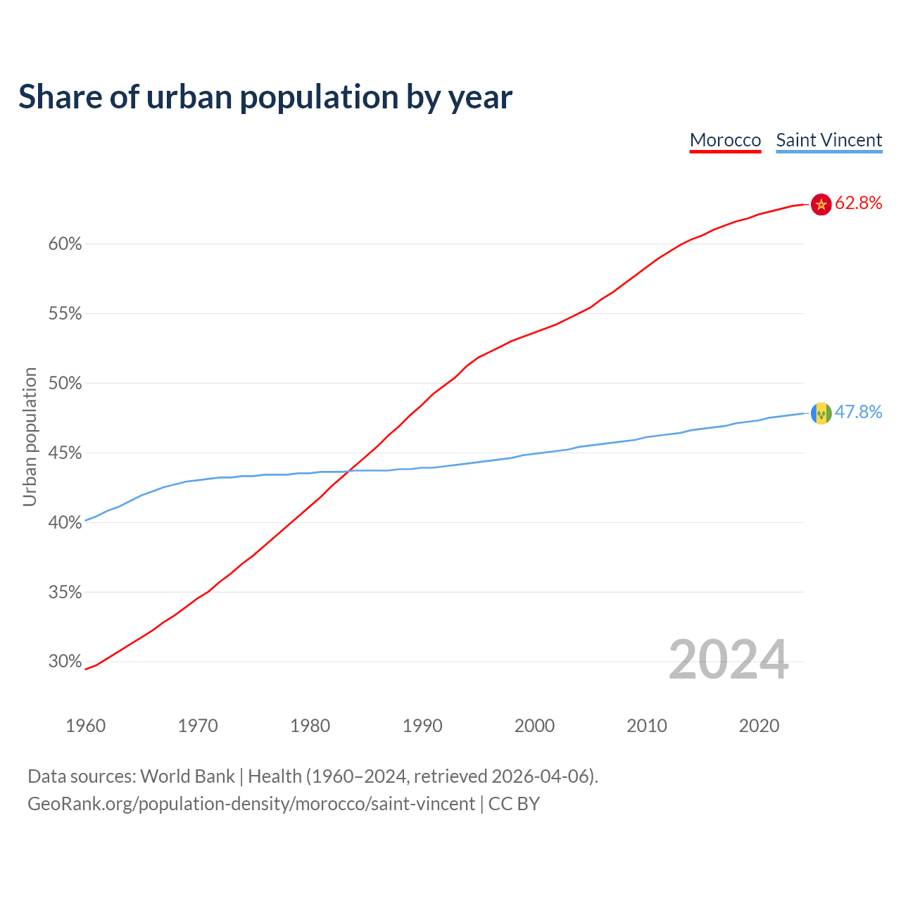 From 2004 to 2024, the share of urban population changed from 55% to 62.8% in Morocco and from 45.4% to 47.8% in Saint Vincent.