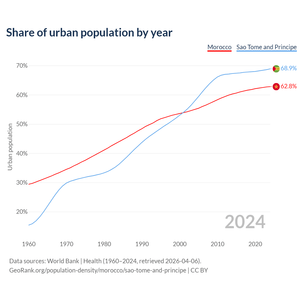 From 2004 to 2024, the share of urban population changed from 55% to 62.8% in Morocco and from 57.9% to 68.9% in Sao Tome and Principe.