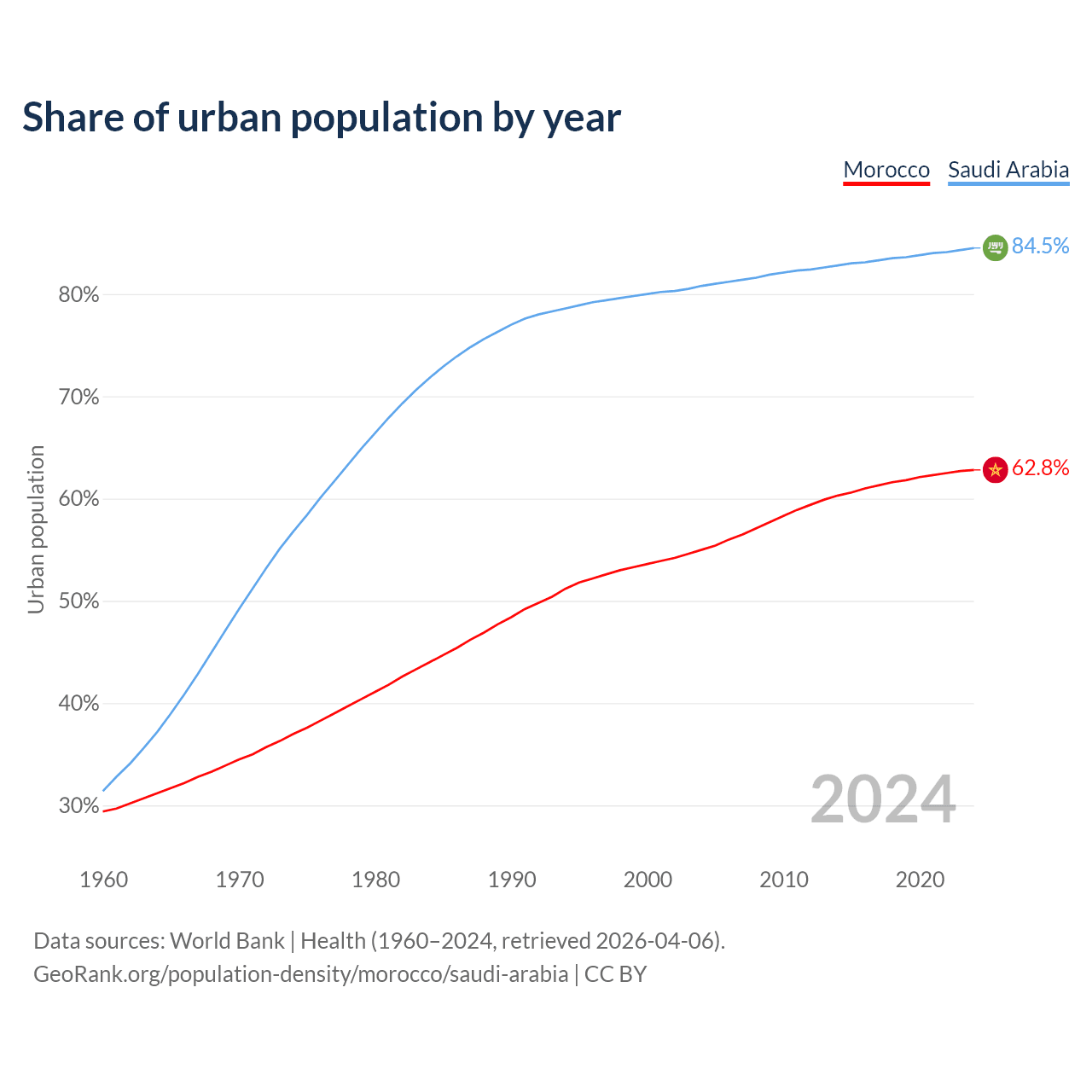 From 2004 to 2024, the share of urban population changed from 55% to 62.8% in Morocco and from 80.8% to 84.5% in Saudi Arabia.