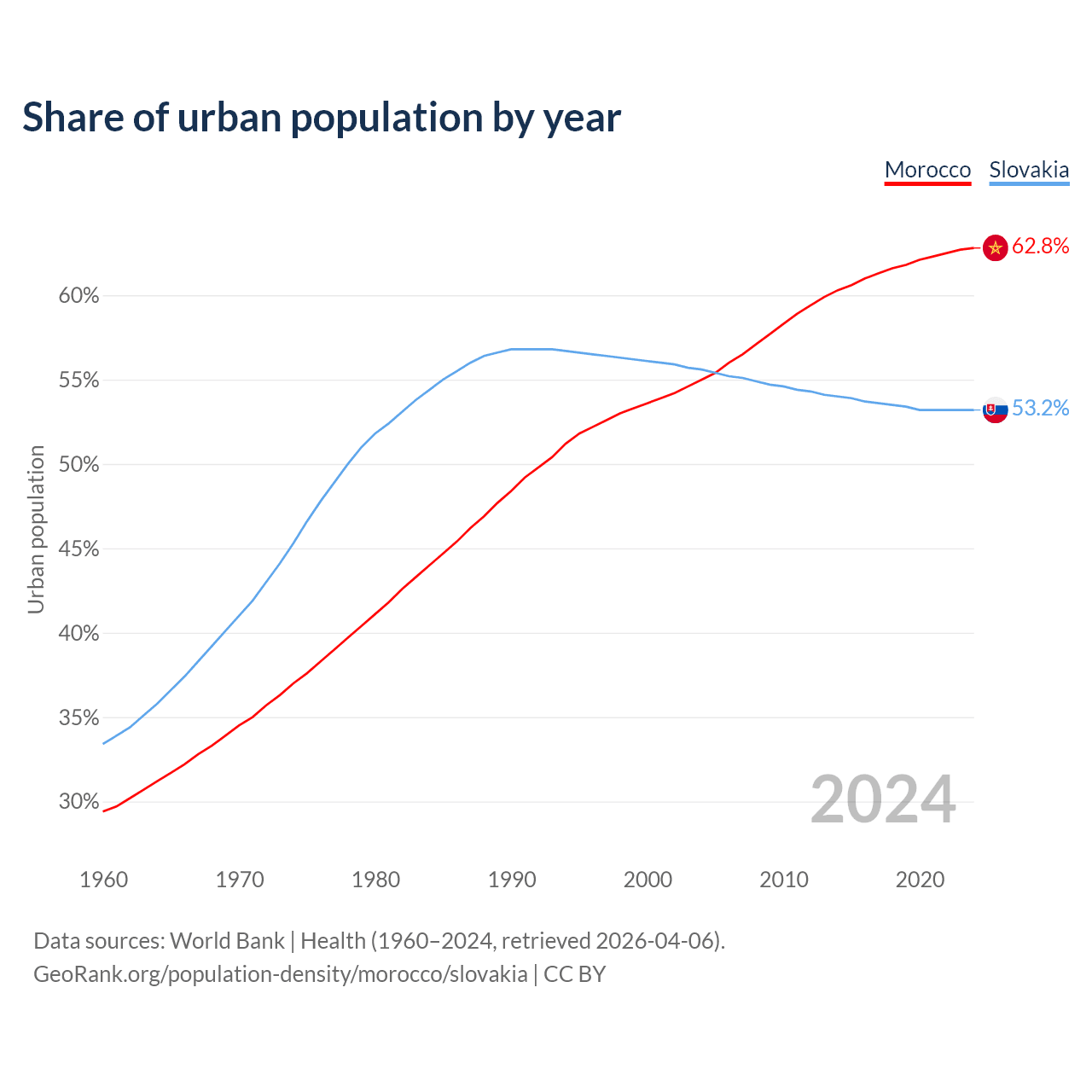 From 2004 to 2024, the share of urban population changed from 55% to 62.8% in Morocco and from 55.6% to 53.2% in Slovakia.