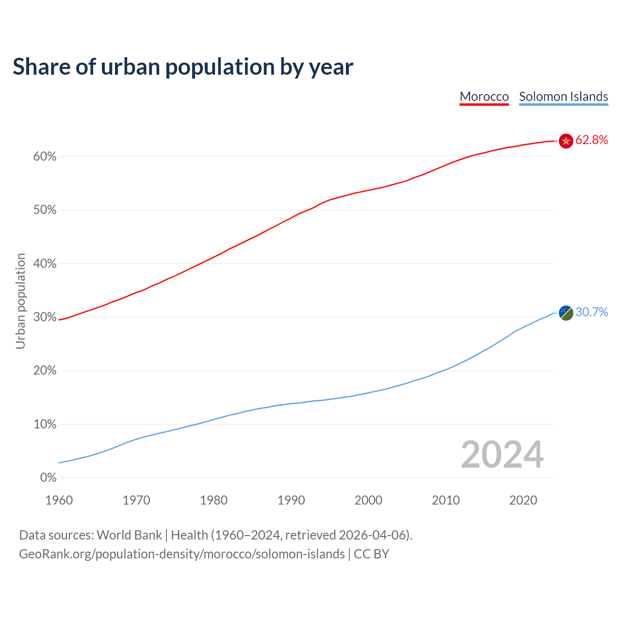 From 2004 to 2024, the share of urban population changed from 55% to 62.8% in Morocco and from 17.2% to 30.7% in the Solomon Islands.