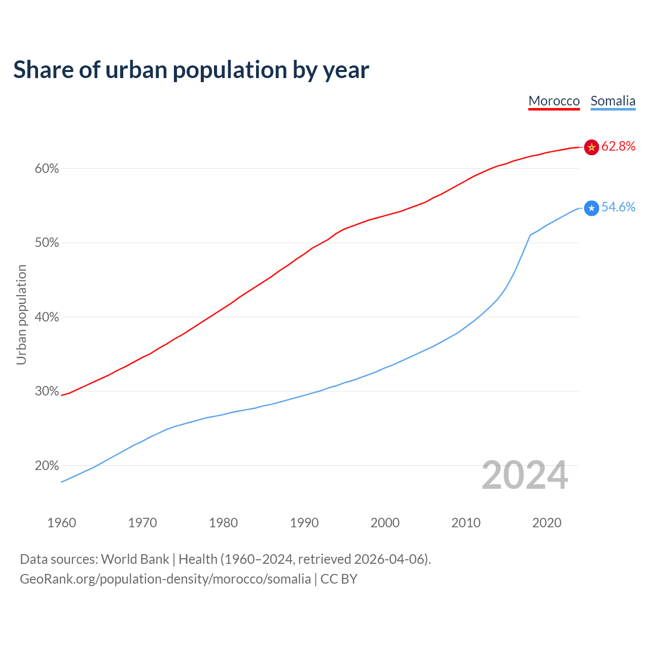 From 2004 to 2024, the share of urban population changed from 55% to 62.8% in Morocco and from 35% to 54.6% in Somalia.