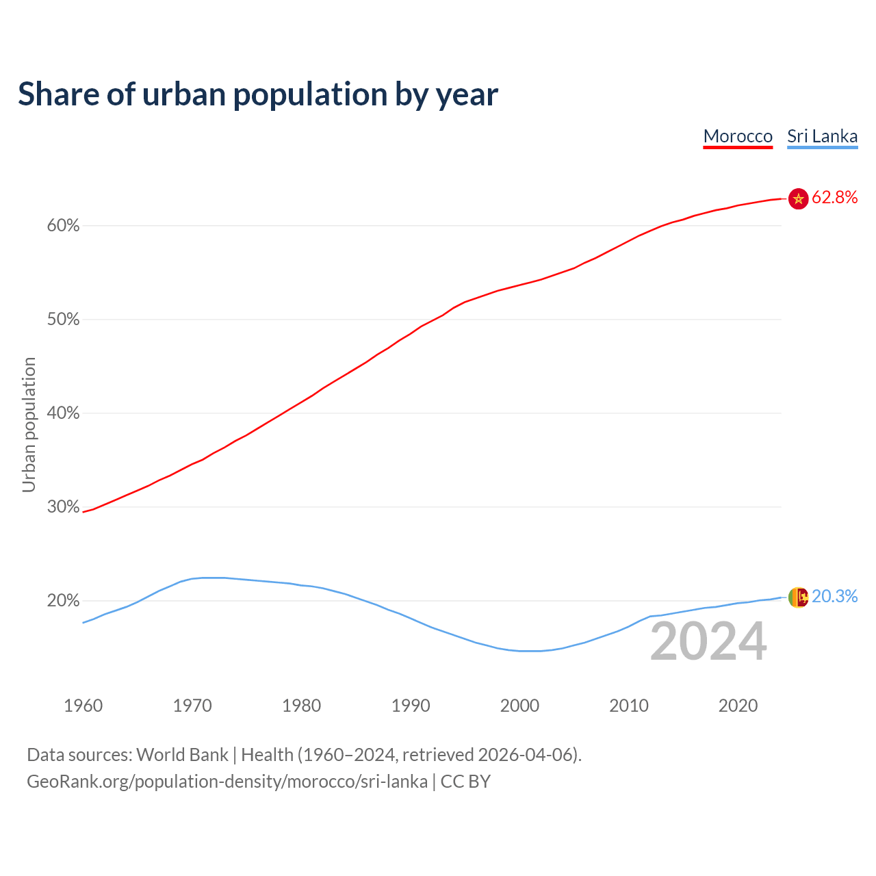 From 2004 to 2024, the share of urban population changed from 55% to 62.8% in Morocco and from 14.9% to 20.3% in Sri Lanka.