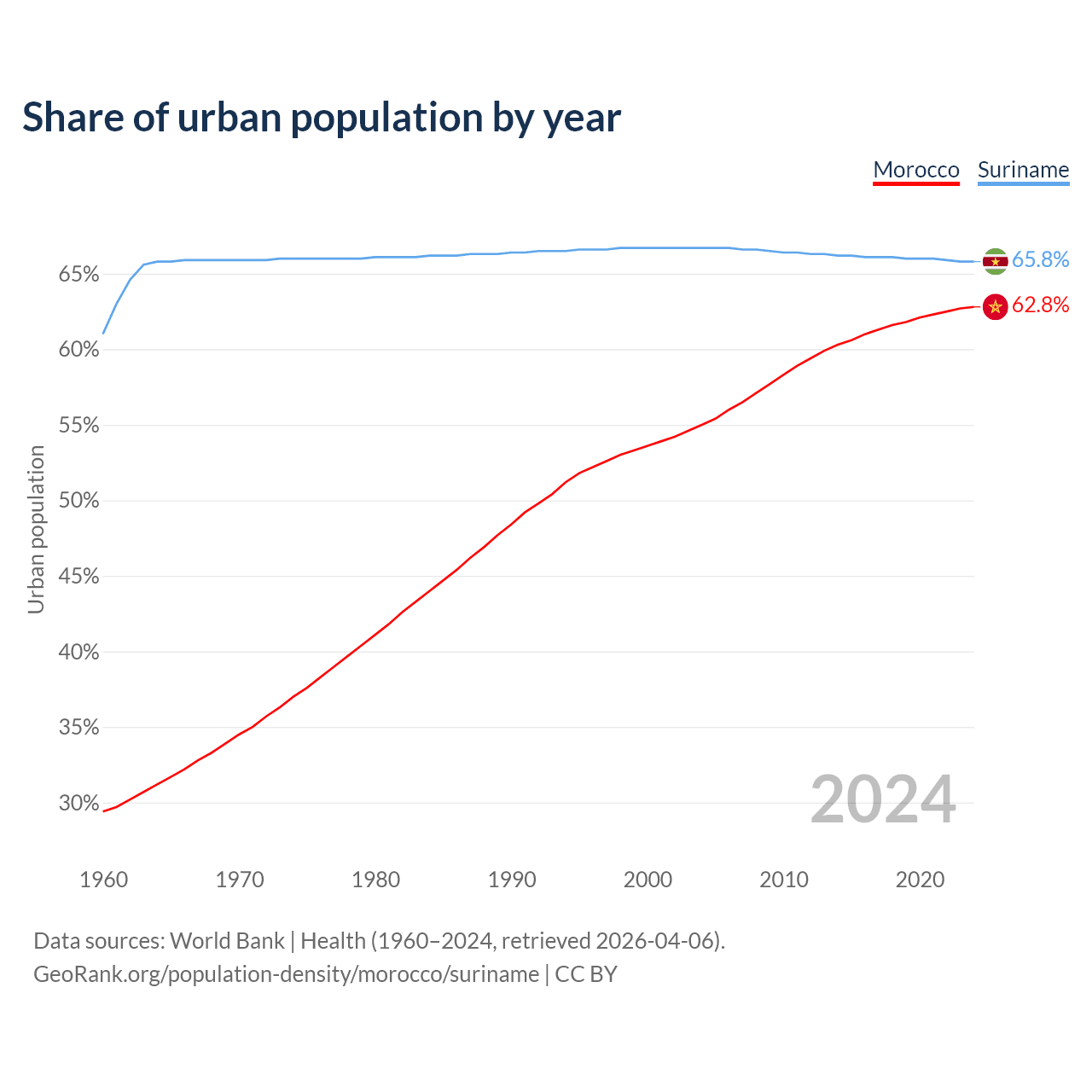 From 2004 to 2024, the share of urban population changed from 55% to 62.8% in Morocco and from 66.7% to 65.8% in Suriname.