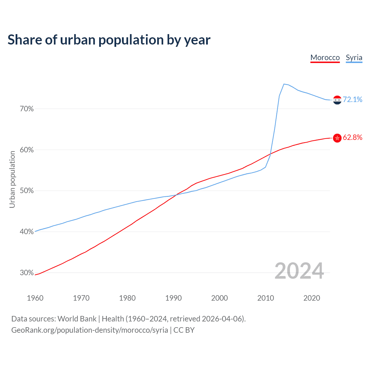 From 2004 to 2024, the share of urban population changed from 55% to 62.8% in Morocco and from 53.5% to 72.1% in Syria.