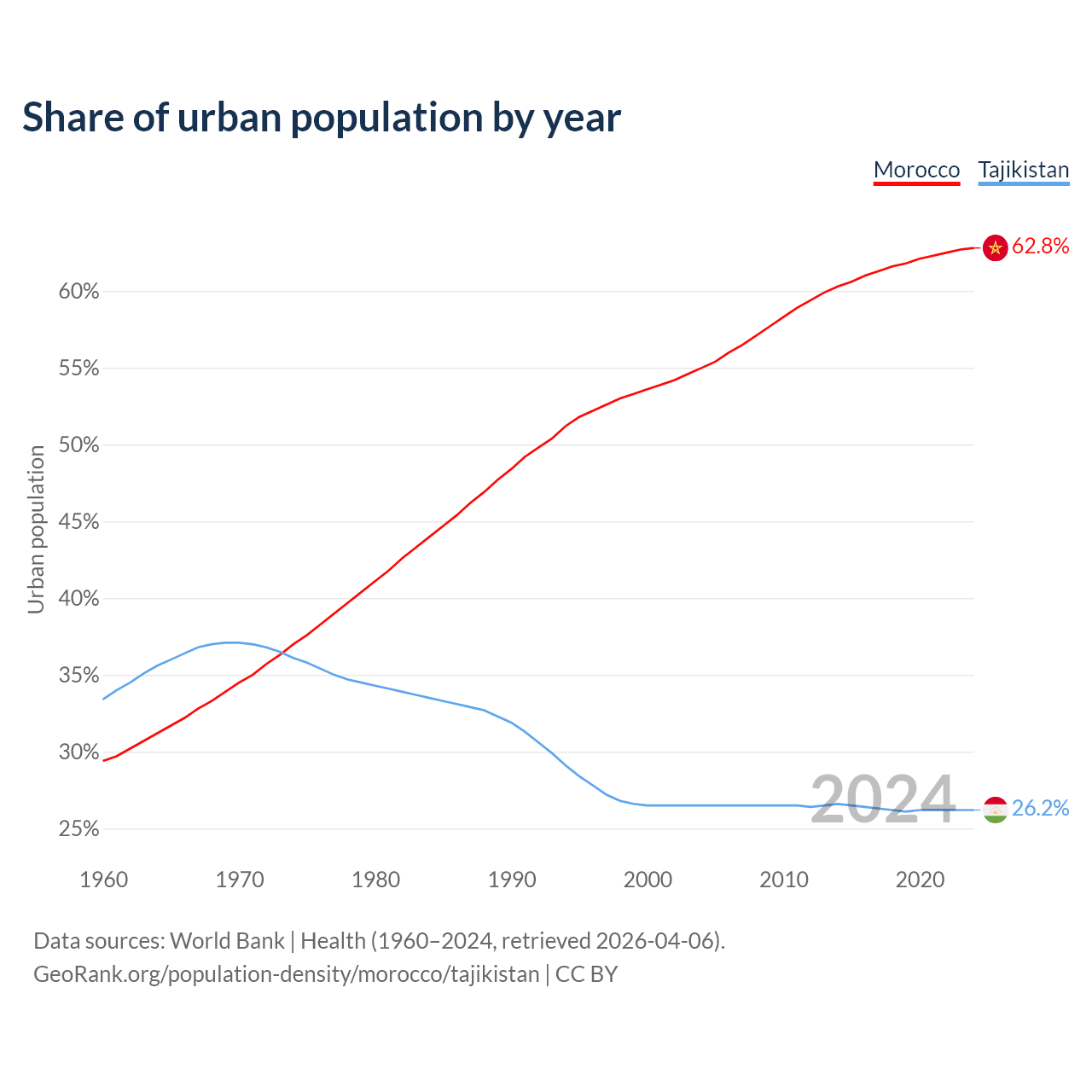 From 2004 to 2024, the share of urban population changed from 55% to 62.8% in Morocco and from 26.5% to 26.2% in Tajikistan.
