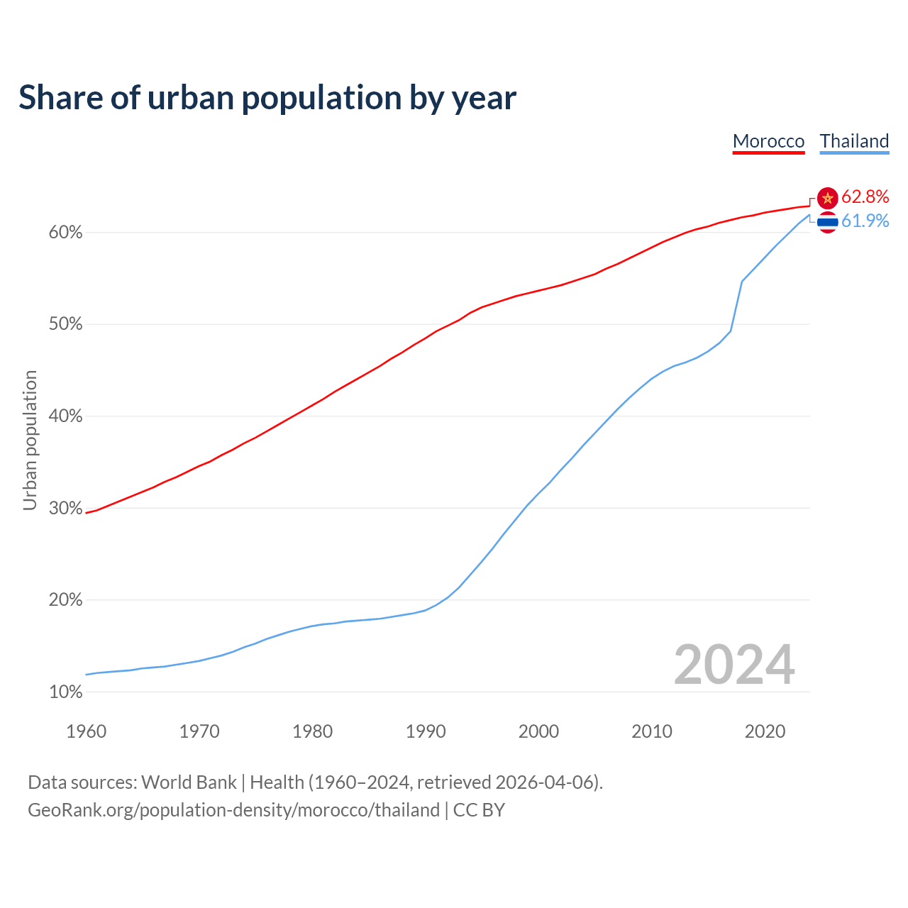 From 2004 to 2024, the share of urban population changed from 55% to 62.8% in Morocco and from 36.8% to 61.9% in Thailand.