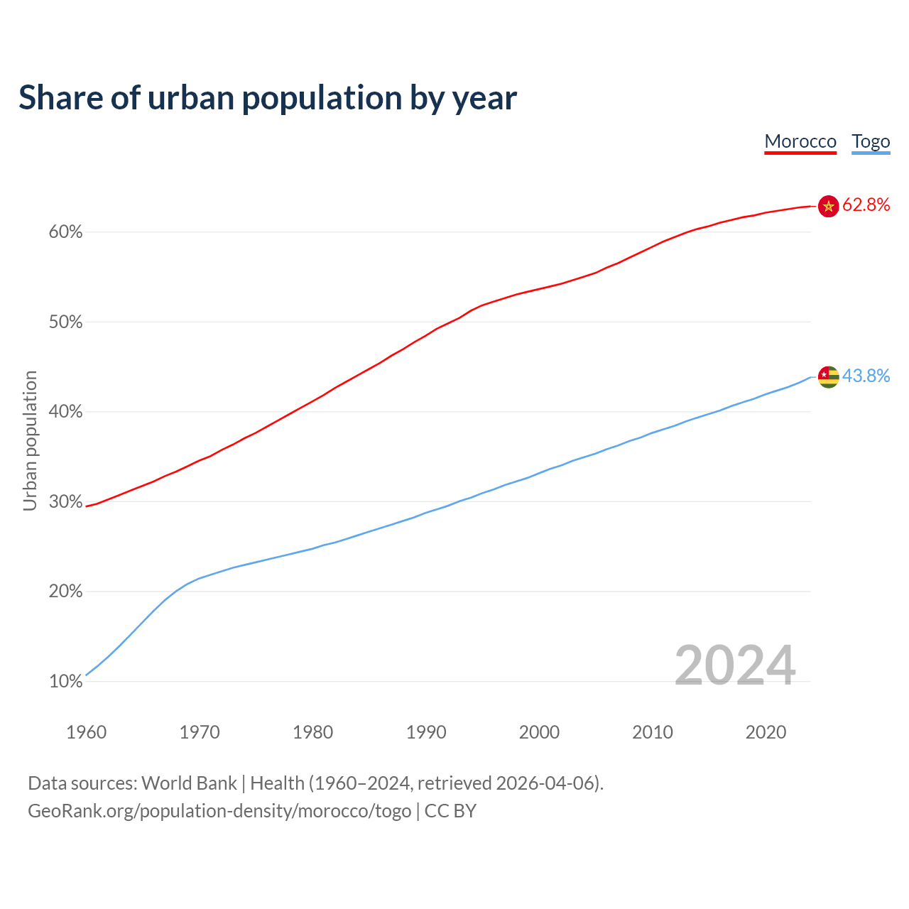 From 2004 to 2024, the share of urban population changed from 55% to 62.8% in Morocco and from 34.9% to 43.8% in Togo.