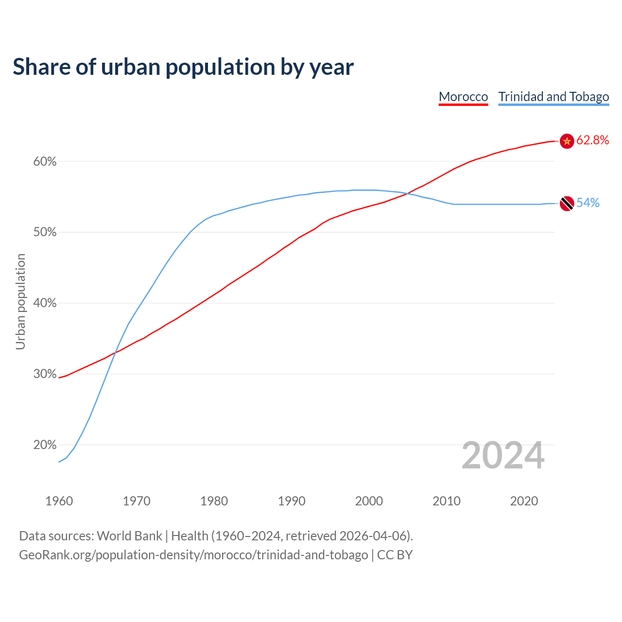 From 2004 to 2024, the share of urban population changed from 55% to 62.8% in Morocco and from 55.6% to 54% in Trinidad and Tobago.