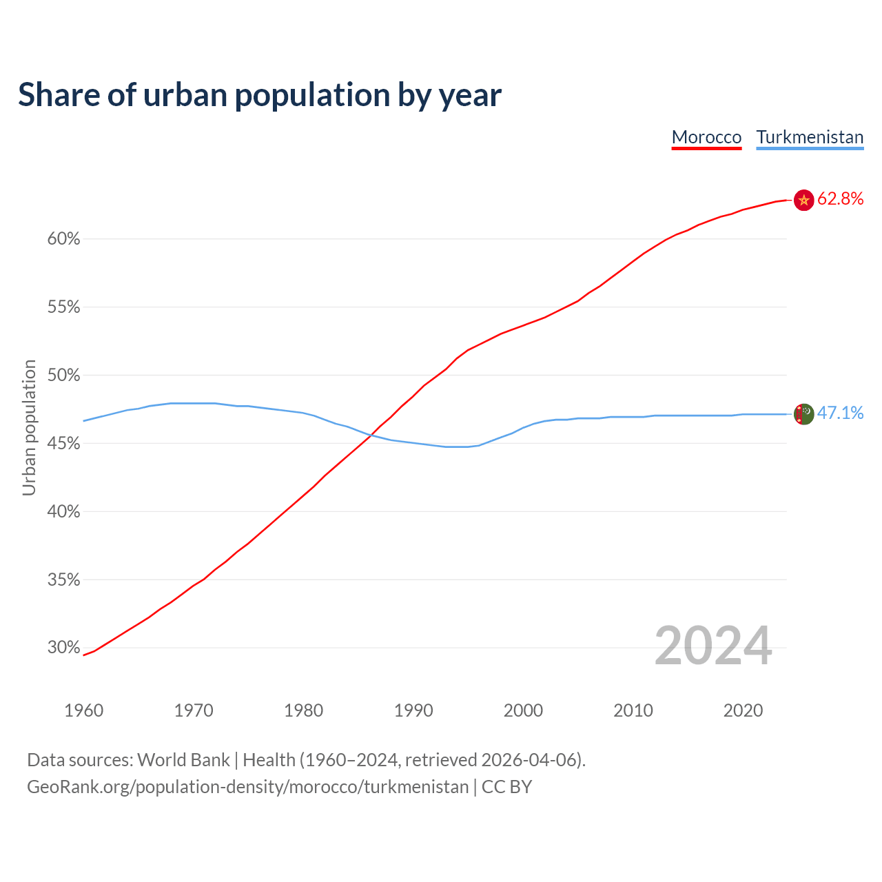 From 2004 to 2024, the share of urban population changed from 55% to 62.8% in Morocco and from 46.7% to 47.1% in Turkmenistan.