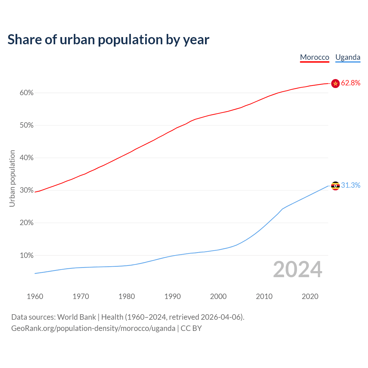 From 2004 to 2024, the share of urban population changed from 55% to 62.8% in Morocco and from 13.1% to 31.3% in Uganda.