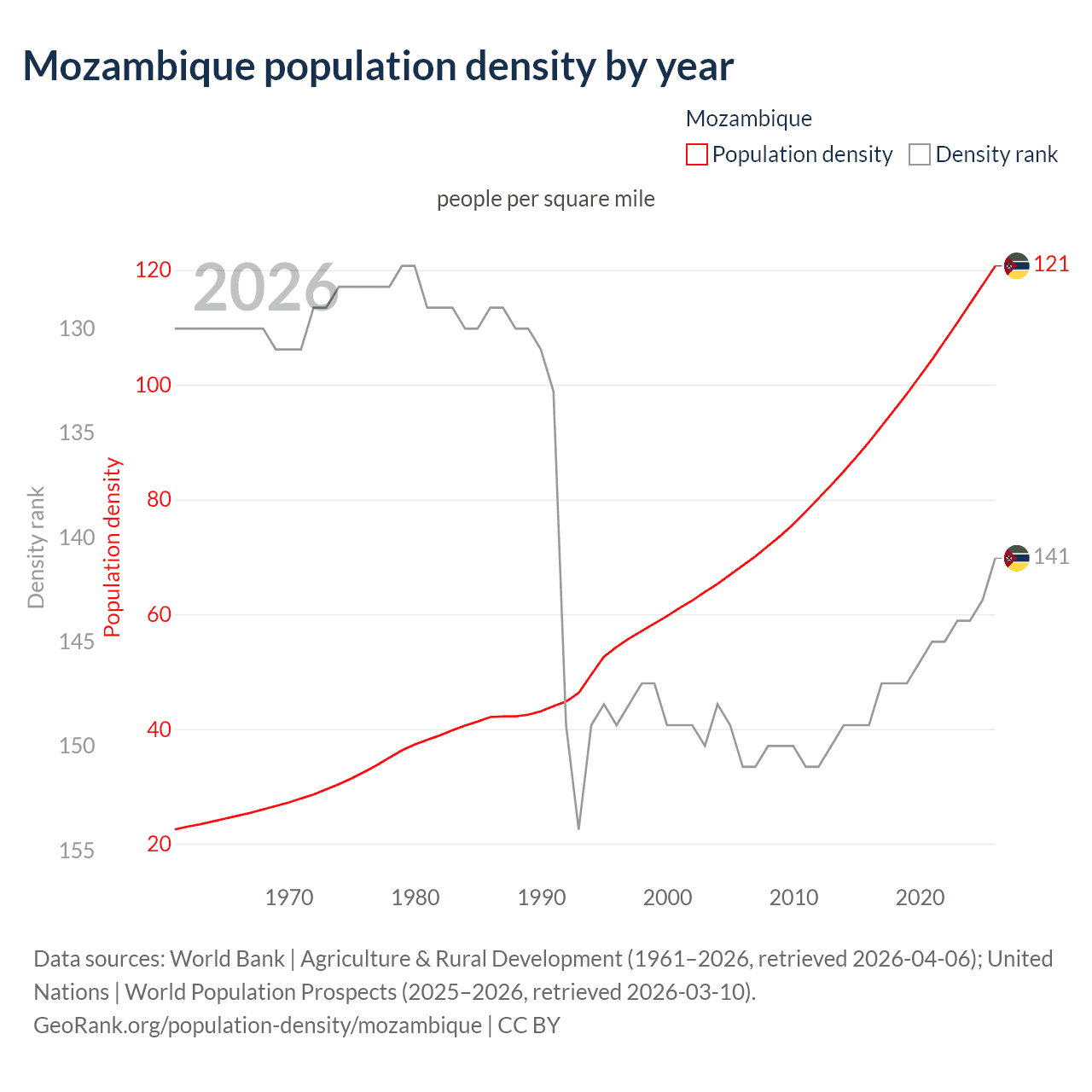 This chart shows how population density in Mozambique has changed over time. From 2006 to 2026, population density increased by 76.4%. Mozambique ranked 151st by population density 20 years ago and ranks 141st today.