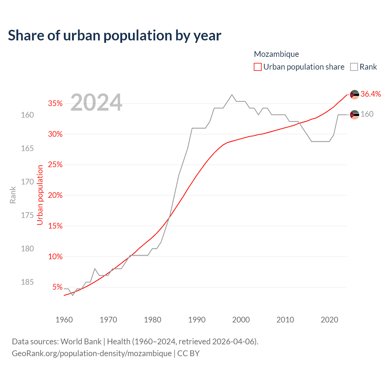 This chart shows the share of urban population in Mozambique from 1960 to 2024: 3.62% lived in urban areas in 1960, 29.2% in 2000, and 36.4% in 2024.