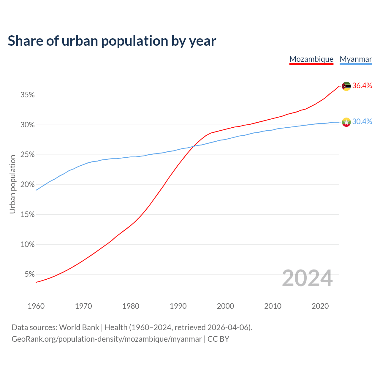 From 2004 to 2024, the share of urban population changed from 29.9% to 36.4% in Mozambique and from 28.2% to 30.4% in Myanmar.